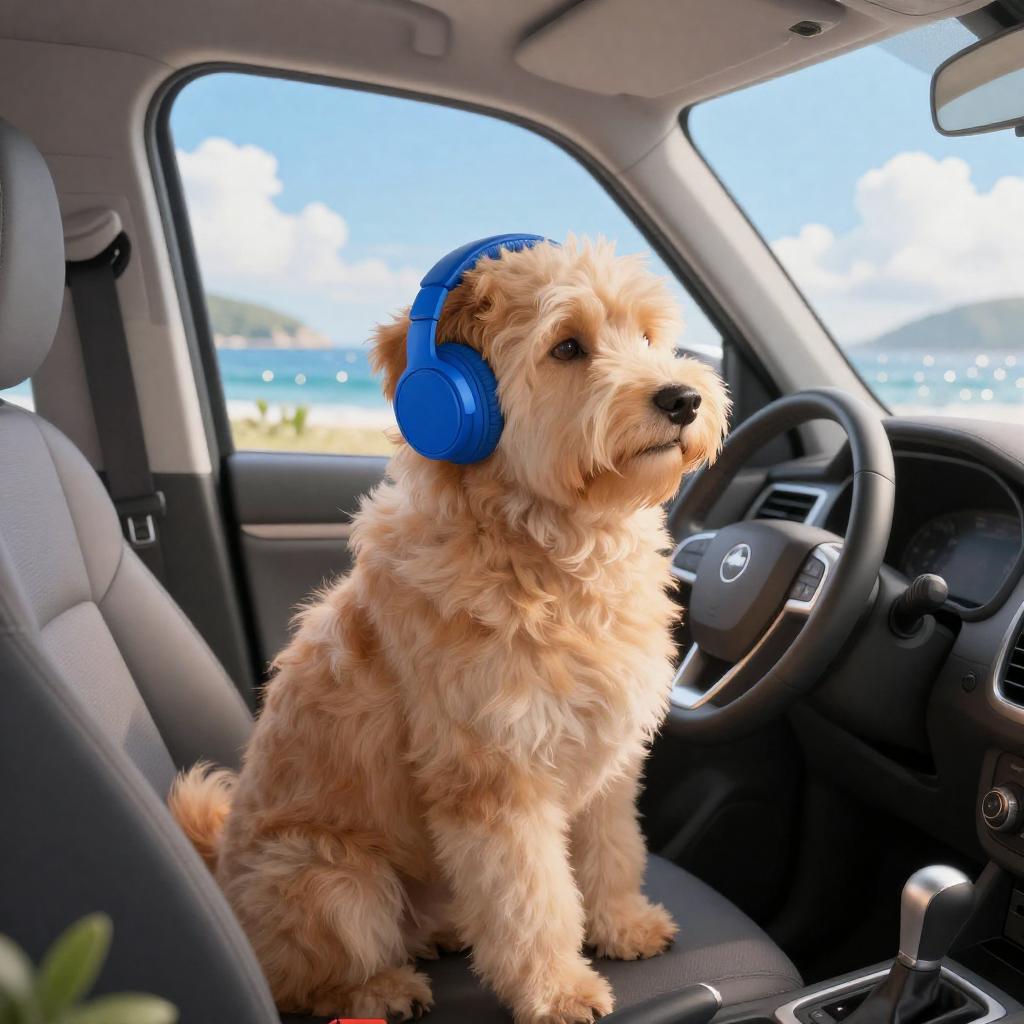A digital illustration of a fluffy, tan, shaggy-haired dog with blue headphones sitting on a car seat, looking out the window at a bright blue sky, white clouds, and a sparkling ocean with green hills in the distance. The car's interior includes a dashboard, steering wheel, and a small green plant outside. The dog has a relaxed, content expression.