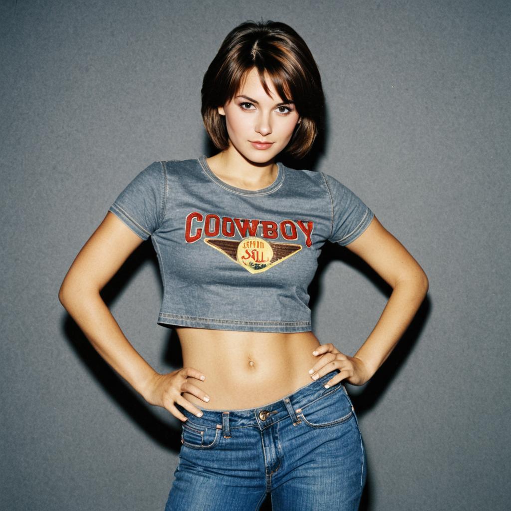 Portrait of a young woman with brown hair and brown eyes wearing a grey denim crop top with the word 'COWBOY' printed on it and blue jeans. She stands with her hands on her hips against a plain grey background, showcasing a casual and confident pose.