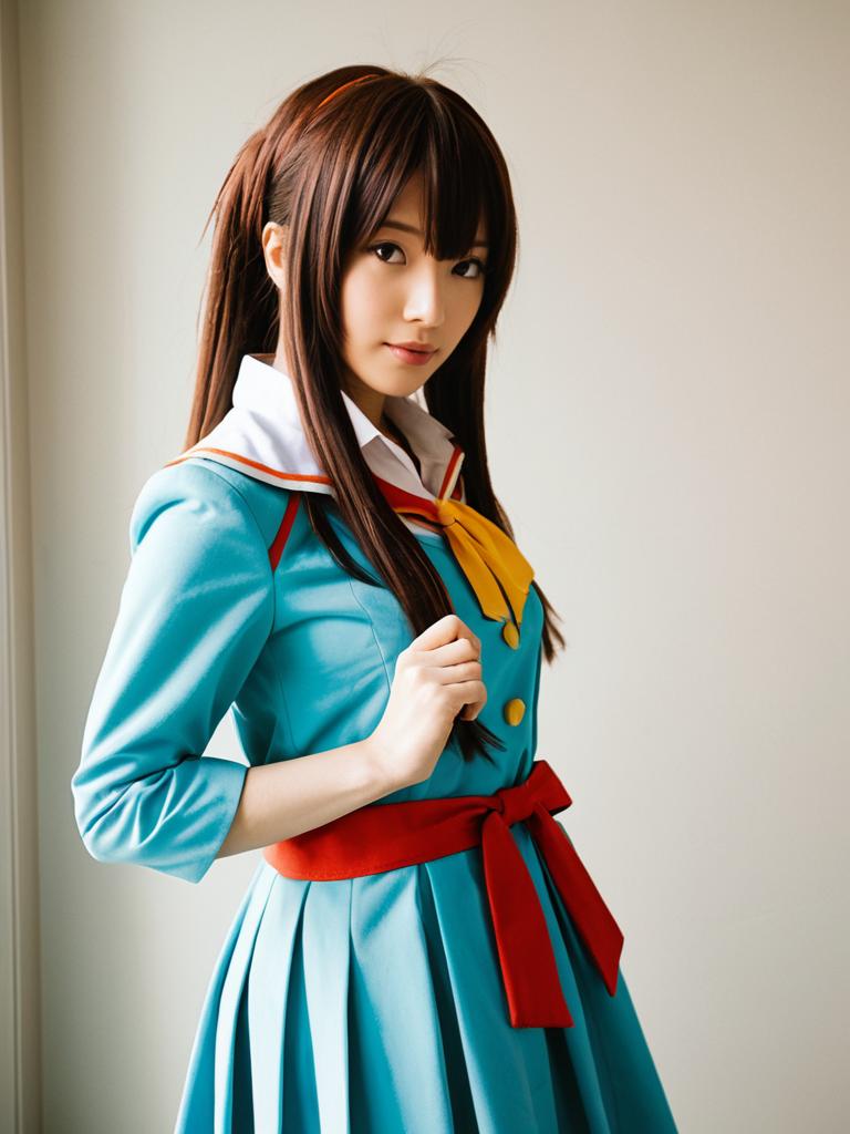 Sexy cosplay woman character wearing Haruhi Fujioka costume. Realistic photo. Jane Doe dressed as Haruhi Fujioka