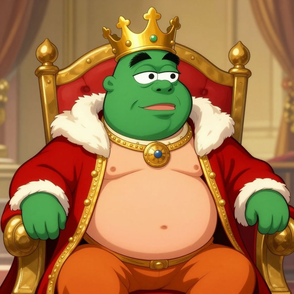 Fat pepe meme portrayed as a chubby king on a throne, wearing a golden crown and royal robes, exaggerated round belly and expressive face, illustrated in a comedic, detailed cartoon style