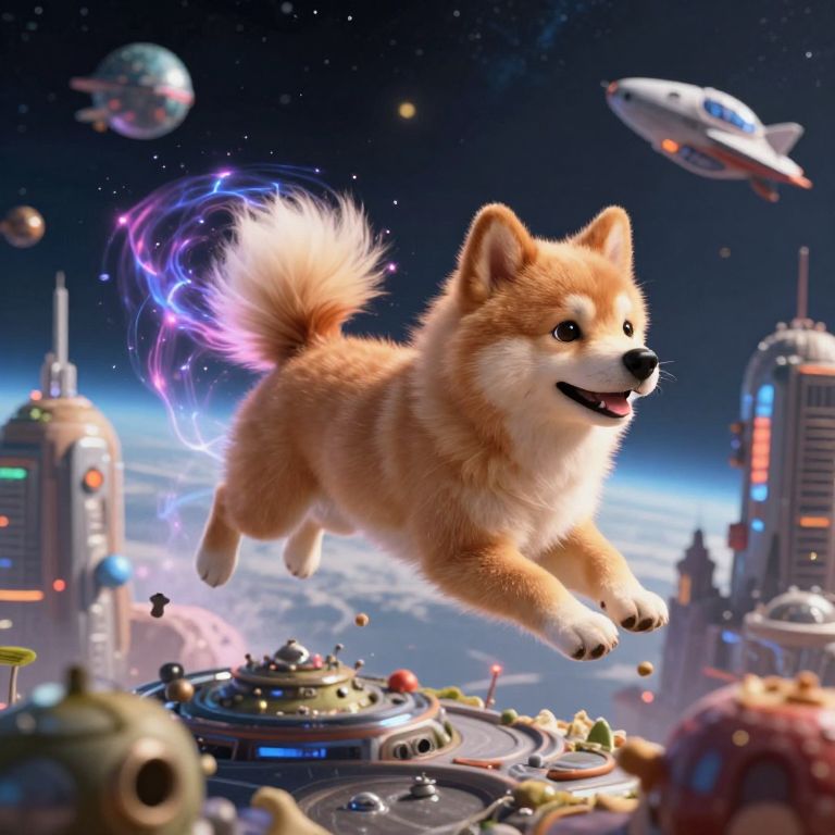CGI image of a fluffy, orange and white Shiba Inu with glowing tail, leaping joyfully above a futuristic cityscape with flying sa