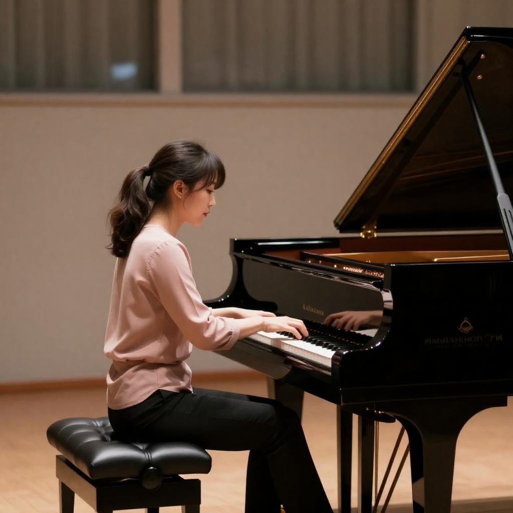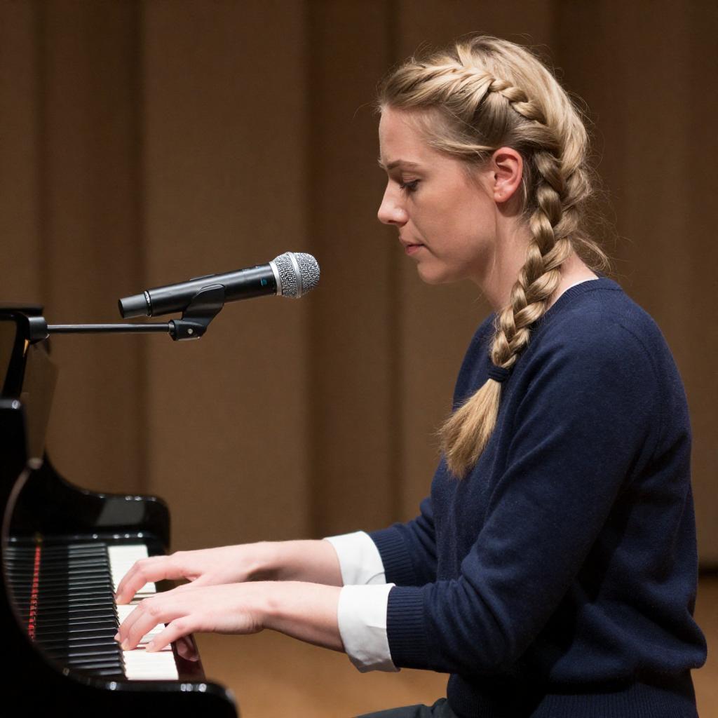 Photograph of a blonde woman with braided hair, wearing a navy sweater over a white shirt, playing a wooden grand piano. She is positioned in profile, facing left, with a microphone on a stand in front of her. The background features brown curtains. Her focused expression suggests concentration.
