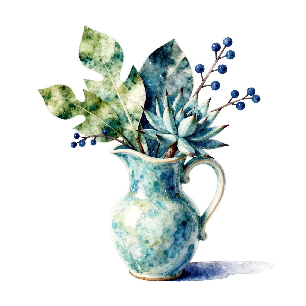A contemporary still-life of a polished aquamarine ceramic pitcher, filled with abstract oceanic leaves, spiky teal succulents, and tiny dark blue berried twigs. Executed in ink-and-watercolor with bold shapes, crisp edges, matte–gloss contrast, and careful negative space. Clean white gallery backdrop, vivid blues and greens, high contrast, subtle paper grain, refined lighting, serene mood, editorial quality.