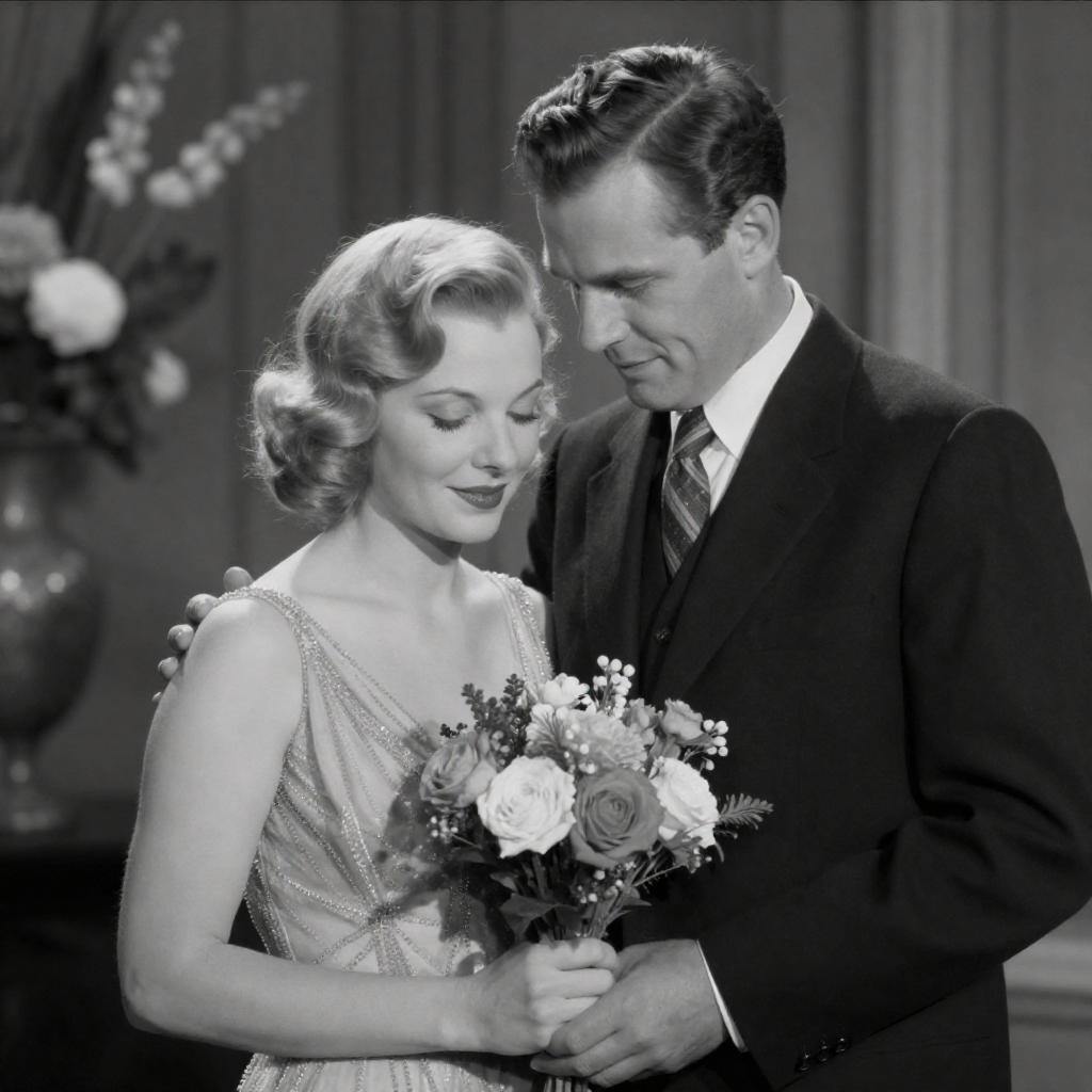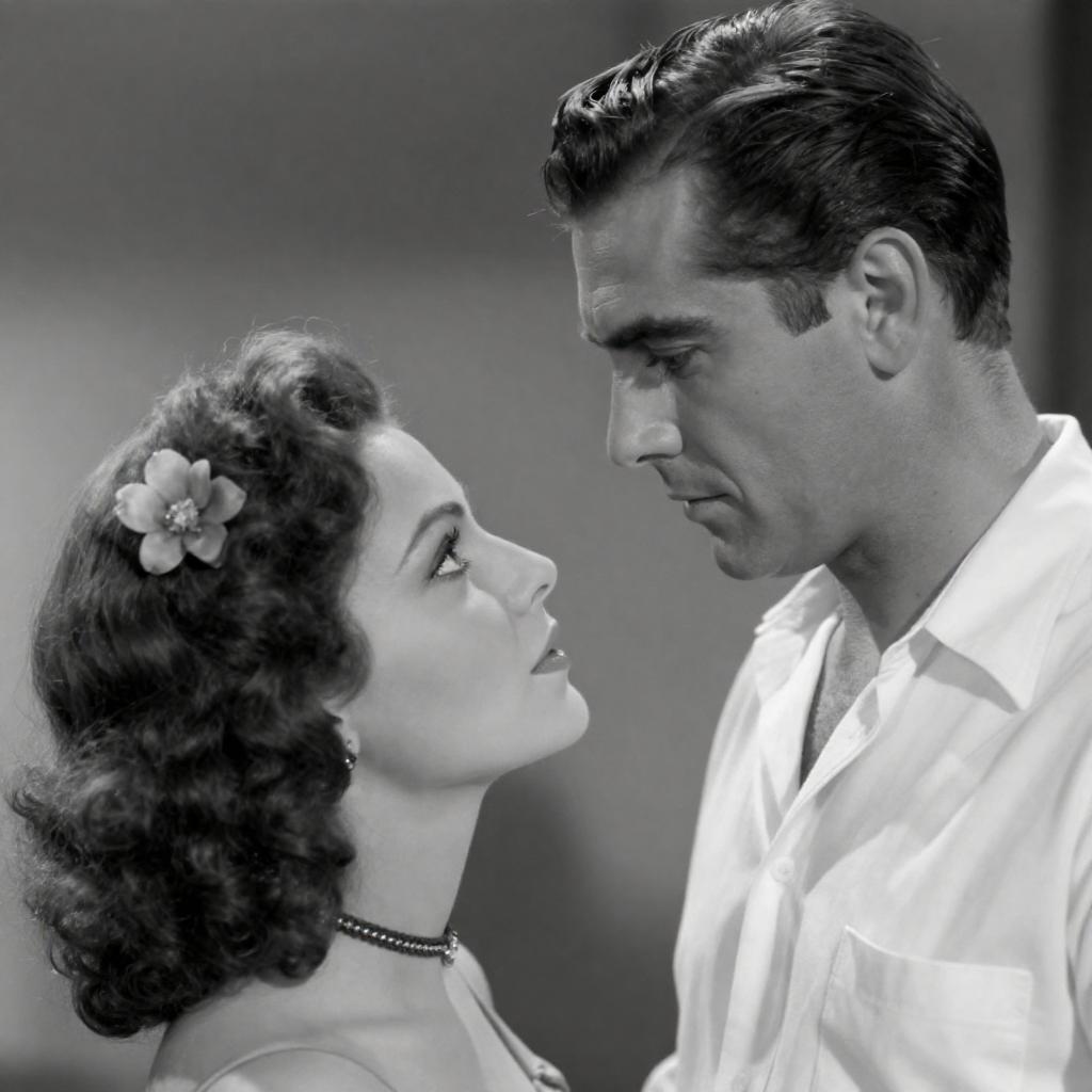 Black-and-white photograph of a 1940s-style couple. A man with dark, slicked-back hair and a plaid shirt embraces a woman with wavy, dark hair and a patterned dress. He leans in to kiss her cheek, his eyes closed, while she gazes forward with a serene expression. Sunlight filters through trees in the blurred background.