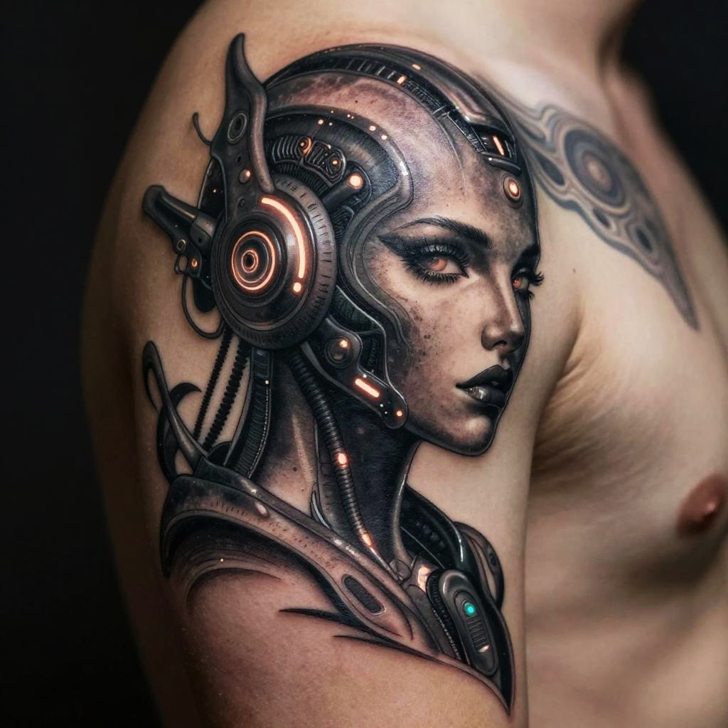 Free ai tattoo generator creating intricate, futuristic tattoo designs on human skin, smooth black and grey ink, detailed line work, modern cyberpunk style, high resolution close-up, glowing neon accents blending with organic shapes