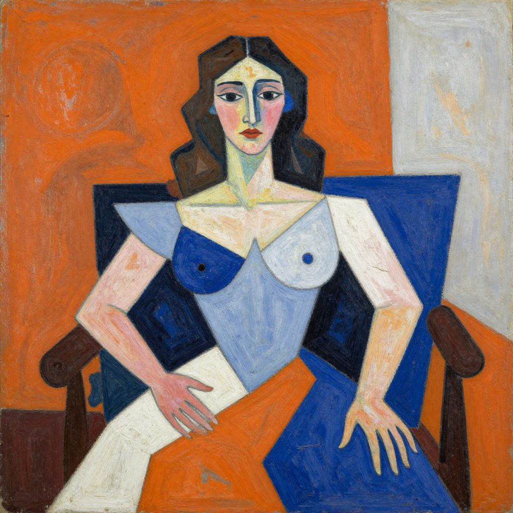 A vibrant and artistic portrayal of a woman composed in a cubist style resembling the works of Picasso, featuring a palette of bold oranges, blues, and whites.