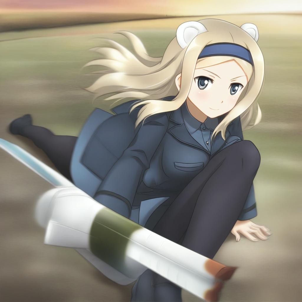 Aleksandra i. pokryshkin, brave witches, 1girl, bear girl, bear ears, blue eyes, blonde hair, long hair, hairband, military uniform, black pantyhose, by artist naru (wish field), leet