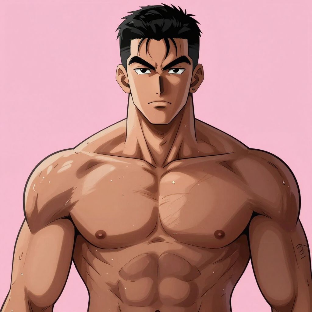 This is a digital anime-style drawing of a muscular, shirtless man with a stern expression. He has short, black, spiky hair and dark eyebrows. His skin is tanned, and his body is highly defined with prominent abs, pectorals, and large biceps. Sweat droplets are visible on his skin, adding a glistening effect. The background is a solid, light pink color, making the subject stand out. His nipples are small and dark. The style features bold lines and shading, typical of anime artwork, emphasizing his muscular physique.
