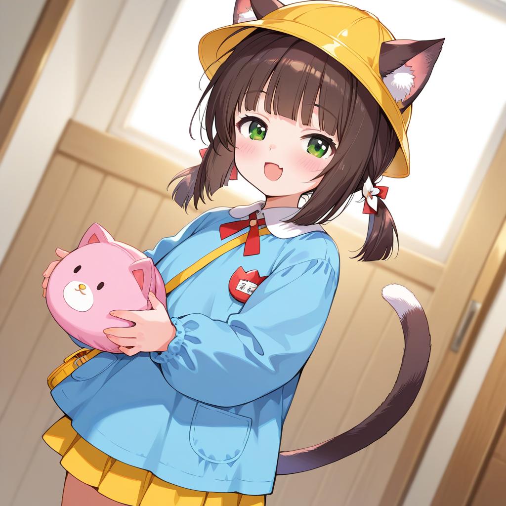 Mutsuki (azur lane), azur lane, 1girl, cat girl, cat ears, cat tail, fang, animal ear fluff, green eyes, brown hair, short hair, long hair, short twintails, blunt bangs, kindergarten uniform, school hat, kindergarten uniform, yellow headwear, blue shirt, yellow skirt, by artist mito (go!go!king!), illustrious