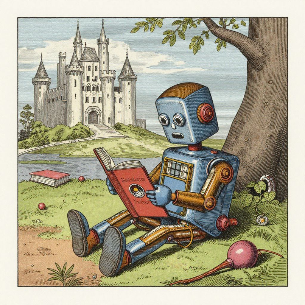 A vintage-style color engraving from an old children's fairy tale book depicting a small, complex robot sitting outdoors under a tree reading a book. In the background, a large castle with multiple towers and spires is visible across a body of water. The scene includes details such as an additional book on the ground and a red object resembling a toy or tool.