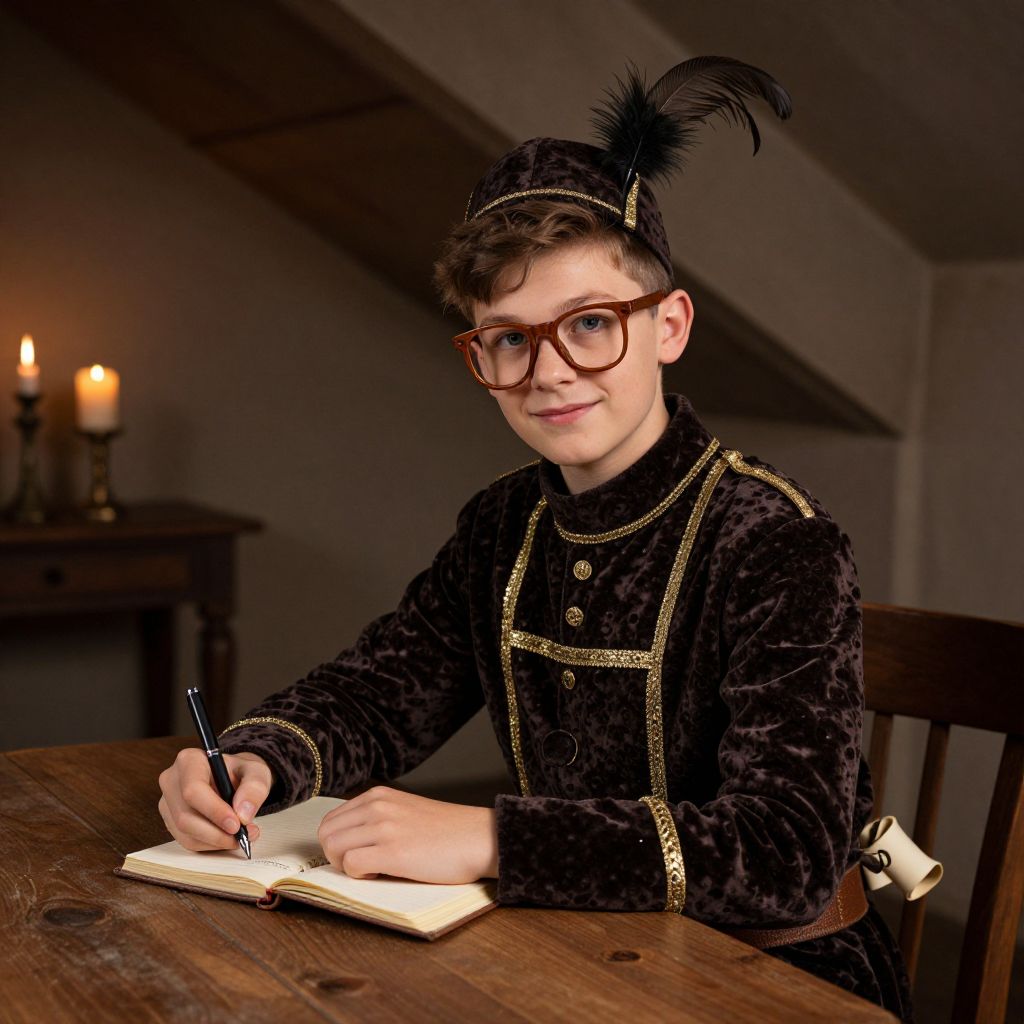 A 16-year-old boy in a detailed wise boy costume made of dark brown velvet and golden trim, with a feathered hat, wooden glasses, and a small scroll tied to his belt, sitting at a rustic wooden table in a candlelit attic room, writing in a journal while looking directly at the viewer with a confident and kind face.