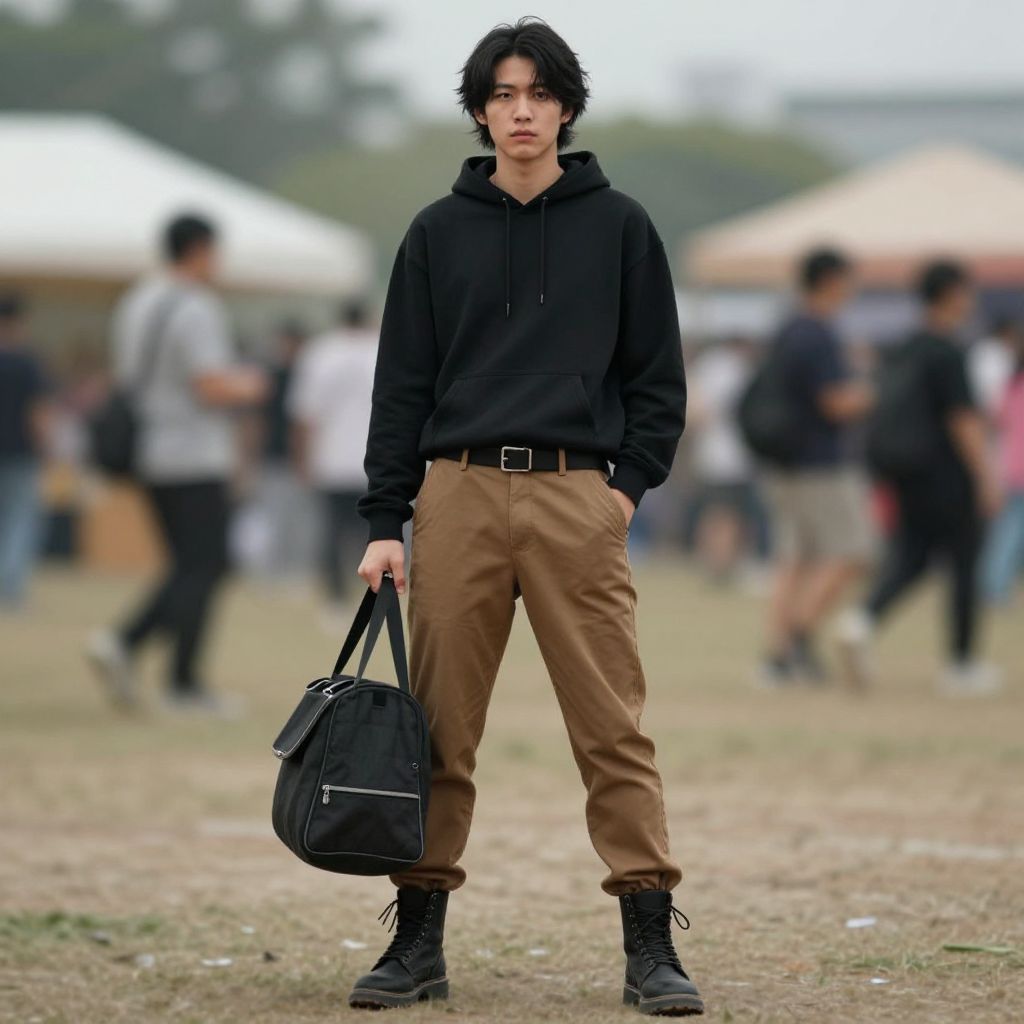 "riot fest costume, male focus, pants, 1boy, outdoors, belt, realistic, brown pants, blurry, bag, full body, looking at viewer, hood, hand in pocket, standing, solo focus, black hair, hands in pockets, blurry background, boots, hoodie Realistic photo of casual sexy person with pretty face"
