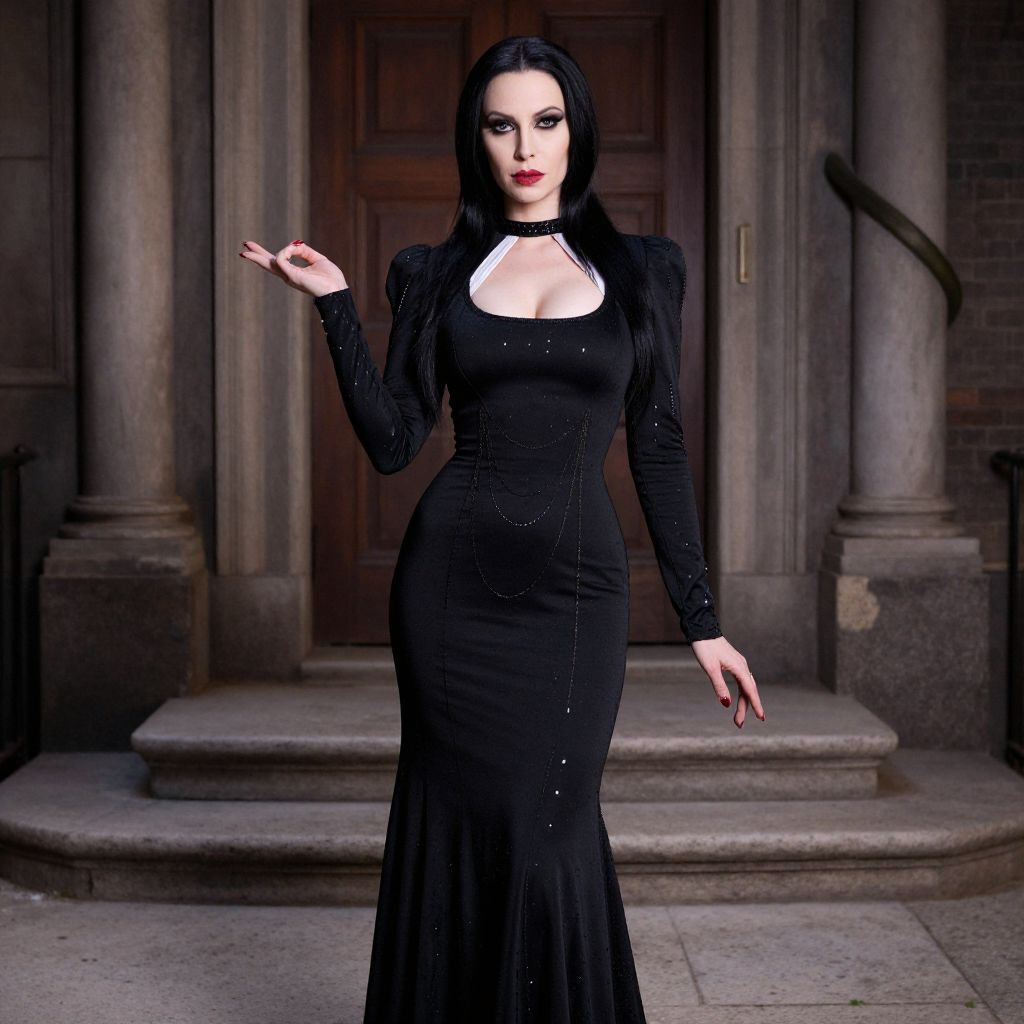 Morticia Addams Costume, a woman in a black dress posing for a picture