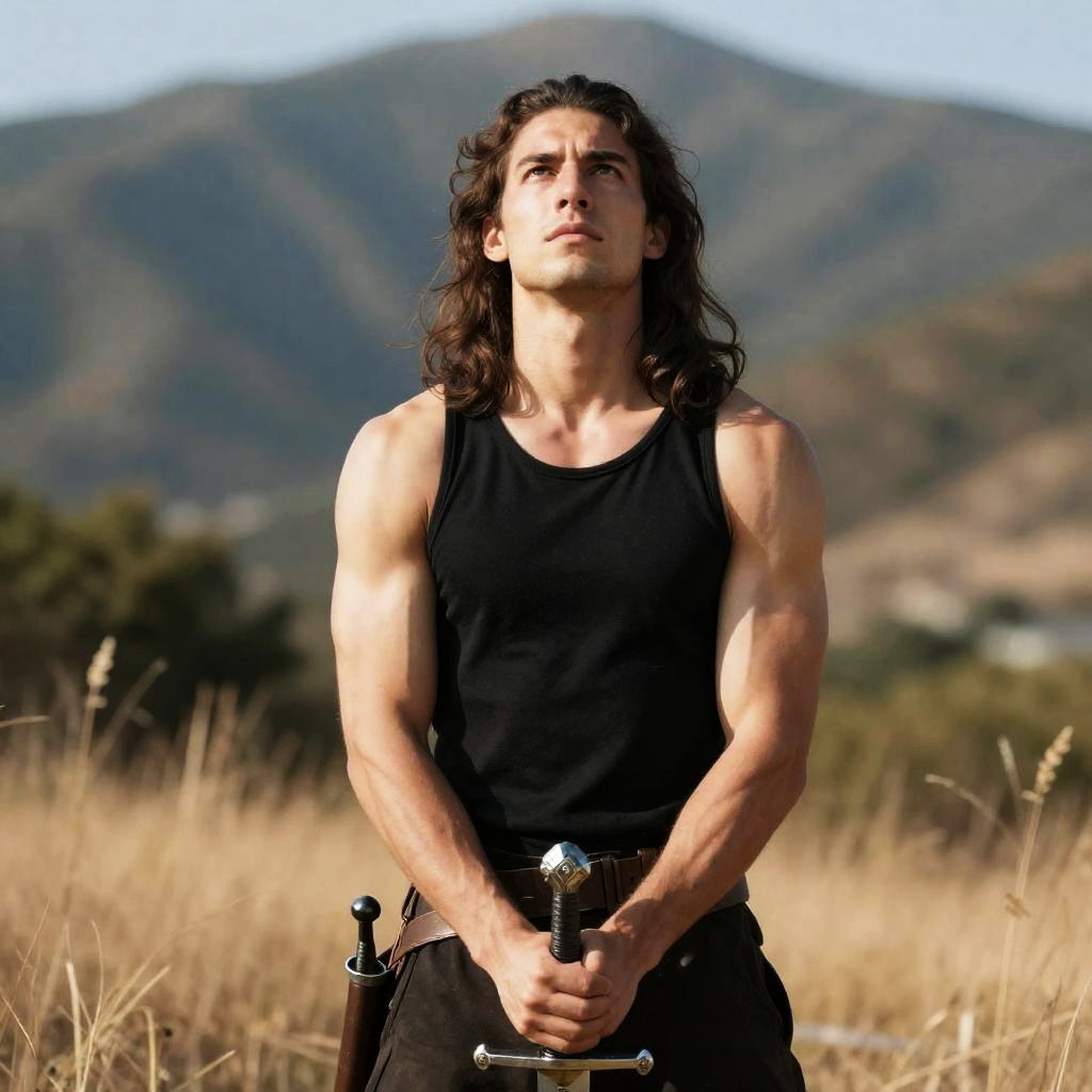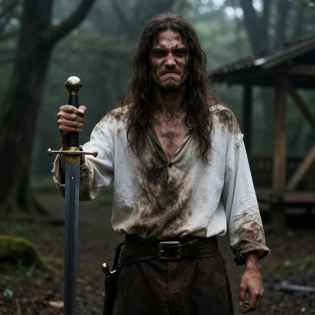 Photograph of a dirty, long-haired man with a grimace, wearing a tattered white shirt and brown pants, holding a sword with a black leather-wrapped hilt, standing in a dark, misty forest with wooden structures in the background.