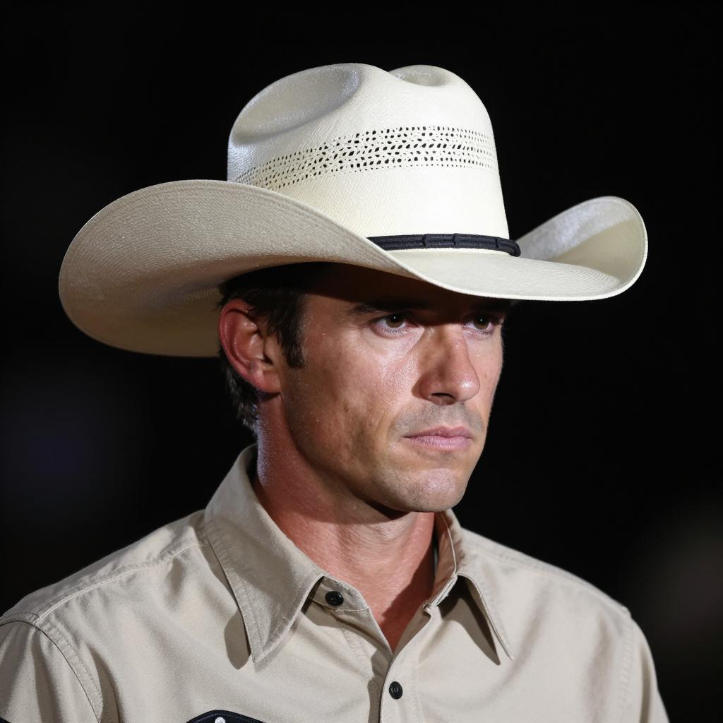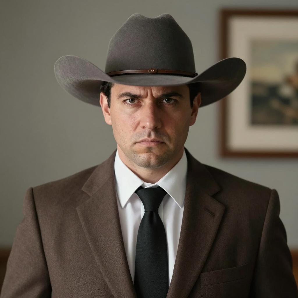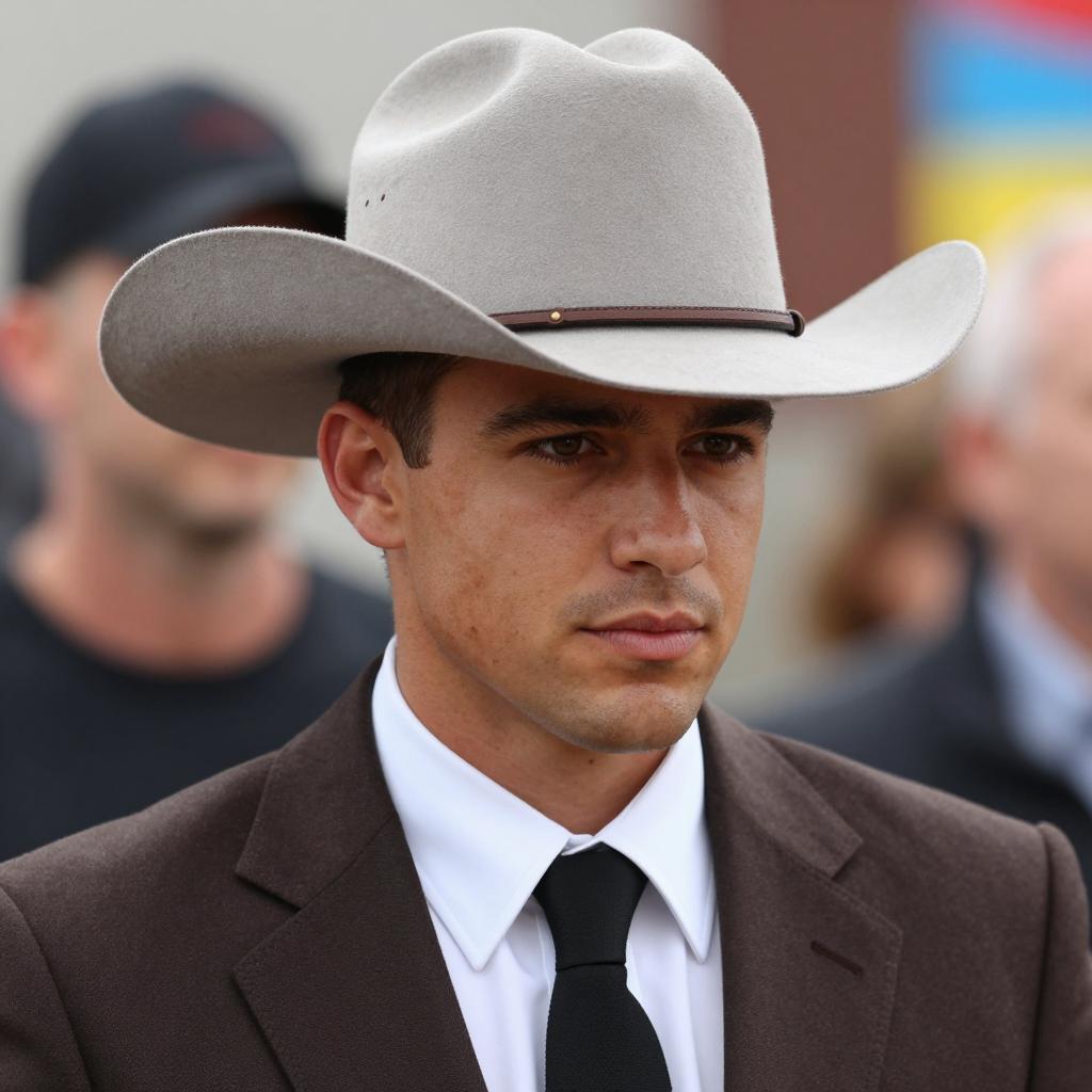 Man with light brown skin, short brown hair, wearing a light gray felt cowboy hat with a brown band, and a dark brown suit with a white shirt and black tie. Background includes blurred figures, one wearing a black cap, and a colorful object. Neutral facial expression. Photorealistic style.