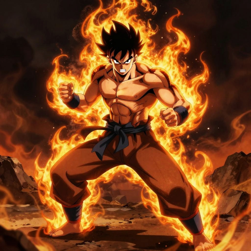 This digital drawing in an anime style features a muscular, shirtless male character with spiky black hair and intense, white eyes. He has a determined expression and clenched fists, surrounded by fiery orange and yellow flames. His skin is fair, and he wears orange pants with a blue waistband and wristbands. The dark, stormy sky in the background contrasts with his bright, glowing aura. The character's defined muscles and powerful stance emphasize his strength and readiness for battle. The overall composition highlights his dynamic energy and heroic presence.