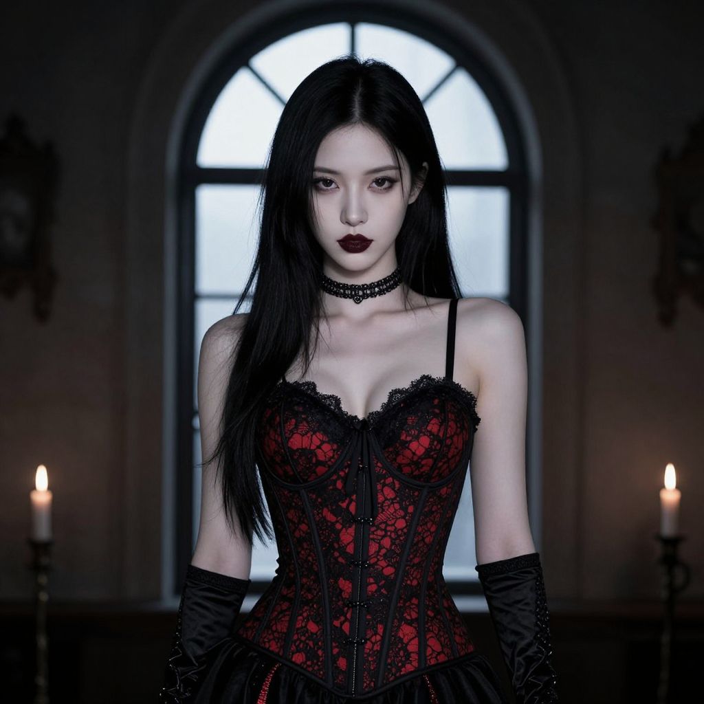 A photograph of a pale-skinned woman with long black hair standing in a dimly lit room with an arched window behind her. She's wearing a black and red lace corset, black gloves, and a black choker. Her dark red lipstick contrasts with her pale complexion. The background is dark, with two lit candles on either side, adding a gothic ambiance.