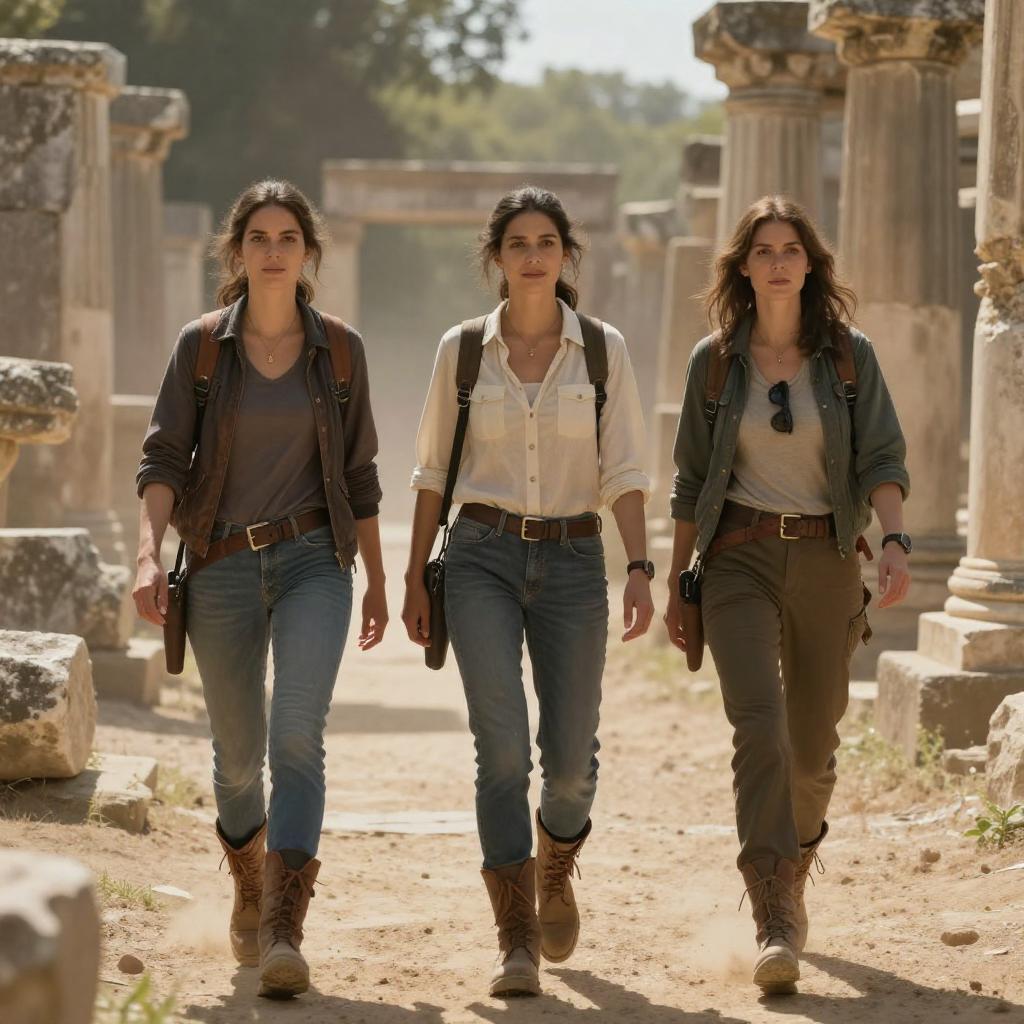 Brunette female characters exploring ancient ruins, dusty environment with crumbling stone pillars, casual explorer outfits with leather gear, dramatic sunlight filtering through trees, realistic style