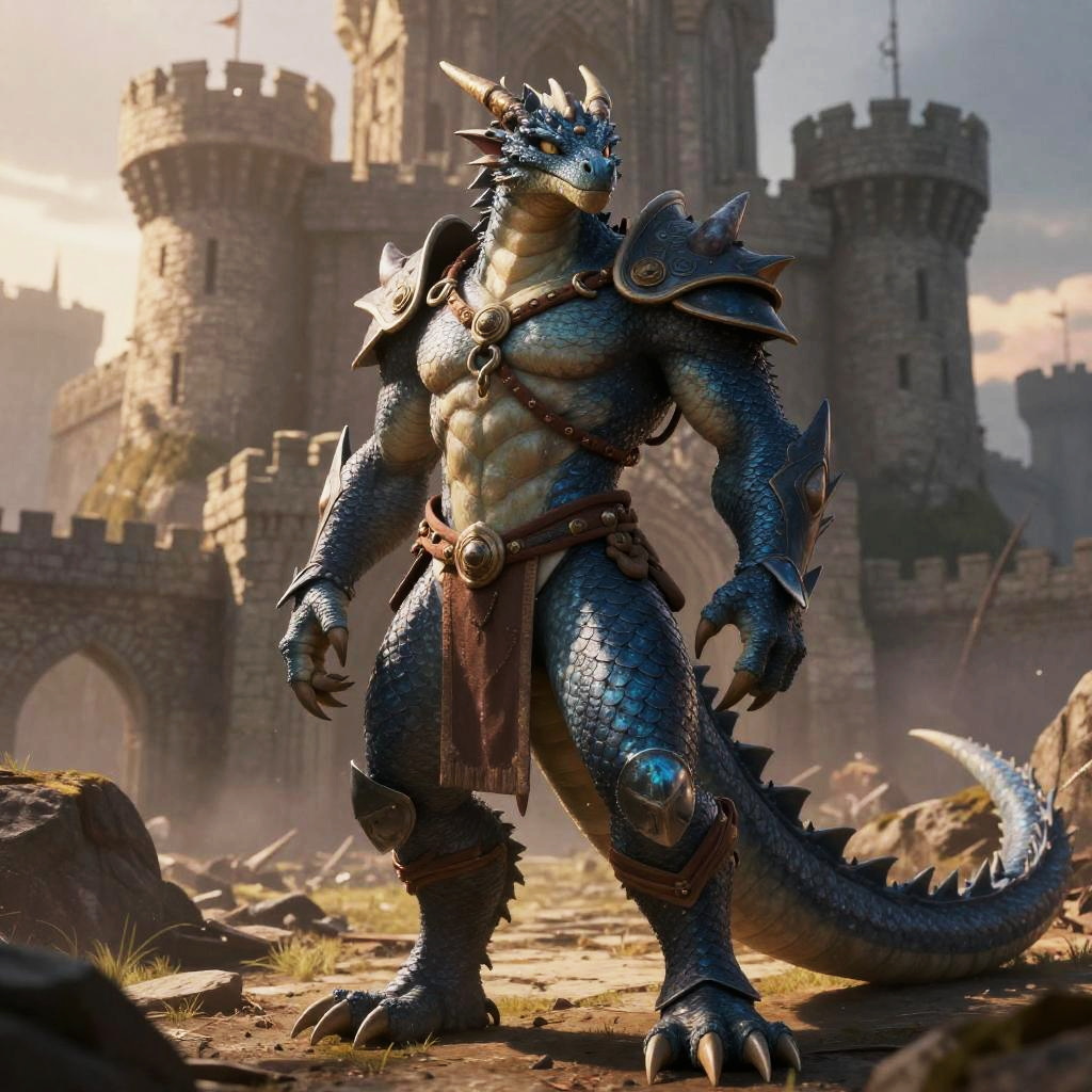 Uploaded on e621, (male anthro dragon), standing, solo, muscle, detailed scale texture, old castle, (battlefield), (tribal clothing, ((long loincloth))), (shoulder armor, leg armor), blue body, white belly, dawn, shaded, dim environment, (front view), looking pleasured, [simple background], detailed eyes, masterpiece artwork, caustics, rim lighting, single light source, sharp shadows, solo portrait, (digitgrade, toe claw), (realistic, photorealistic, hyper realistic, ultra detailed), by kenket, chunie
