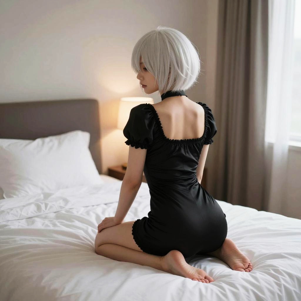 Ass up wait, (photorealistic:1.6), short hair, white hair, black dress, cozzy bedroom, on bed