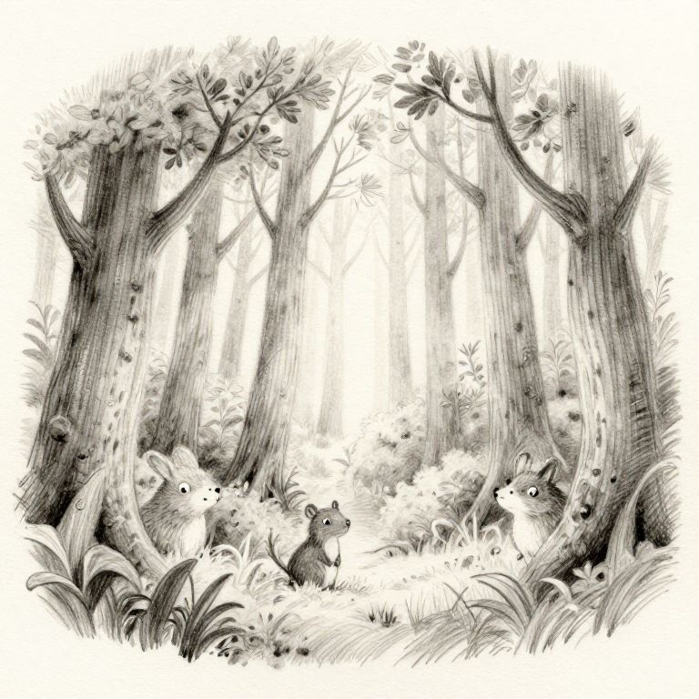 Picture sketch of a whimsical forest with tall trees and curious animals peeking through, soft graphite textures adding layers of depth, gentle contrast, illustrating a fairytale atmosphere, fine sketching style on rough paper.