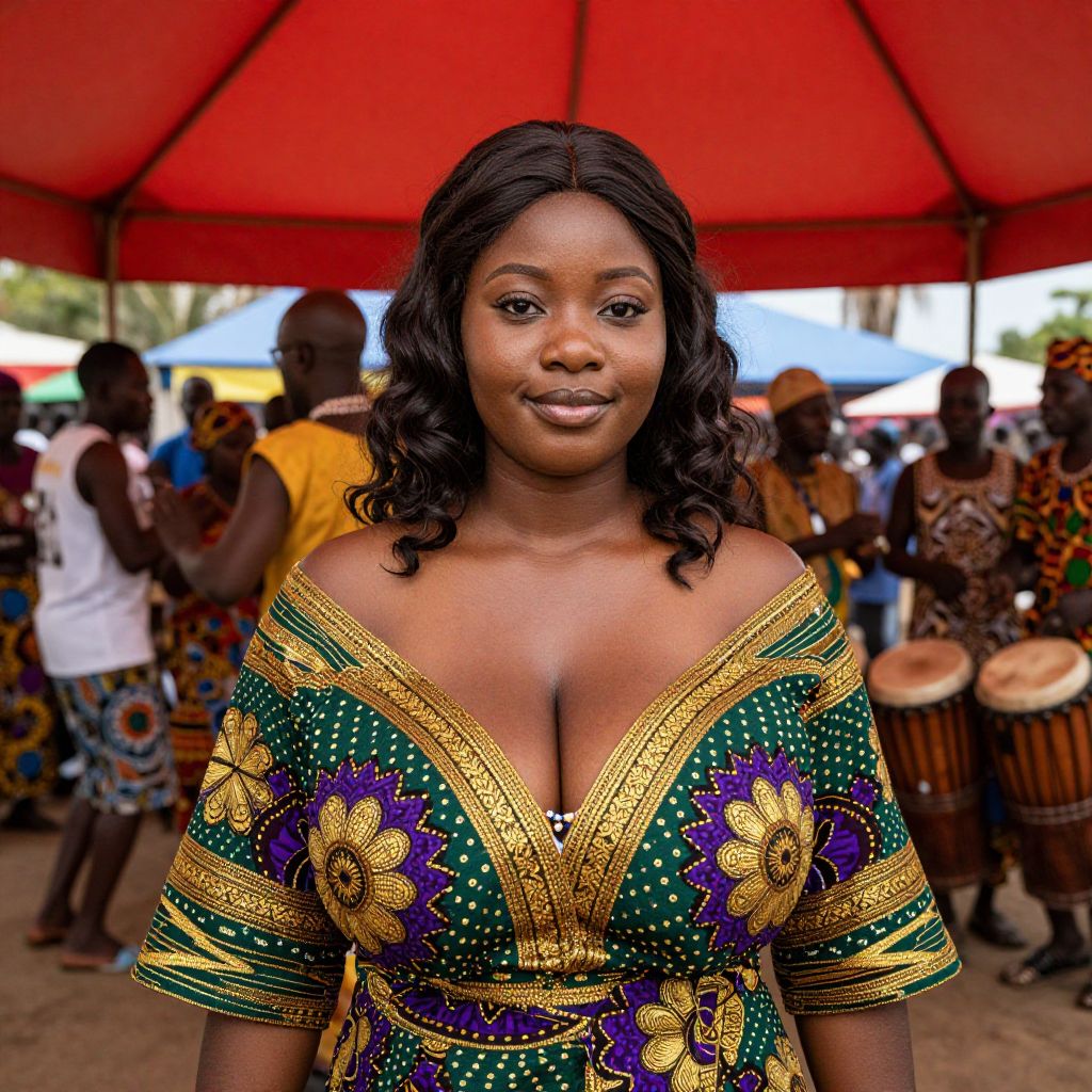 A candid-style photograph of a woman of African descent, with dark, wavy hair and a soft smile, wearing a richly patterned Ivory Coast traditional wrap costume with intricate woven patterns in gold, deep green, and purple, standing under a vibrant red-tinted awning in a cultural festival in Douala, with people dancing in the background and traditional drums echoing softly. The woman has big tits and cute face