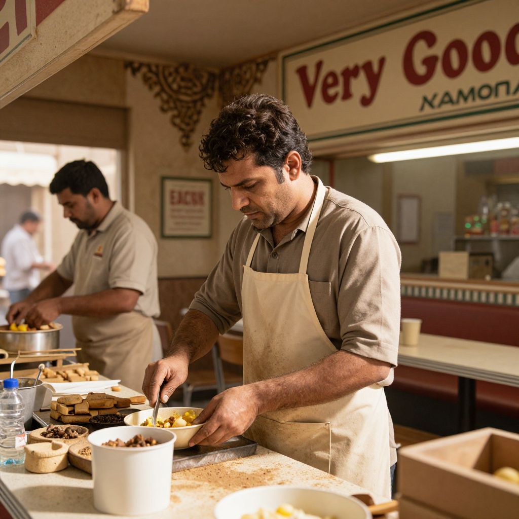 Photograph of a middle-aged South Asian man with curly black hair and a short beard, wearing a beige shirt and white apron, focused on preparing food at a counter in a diner. He is using a spatula in a bowl. Another man in a similar beige shirt and apron is visible in the background, also preparing food. The counter has various dishes, a water bottle, and a cardboard box. The diner has beige walls with a sign reading "Very Good" and a decorative pattern. Lighting is warm, creating a cozy atmosphere. The background is slightly blurred, emphasizing the main subject.