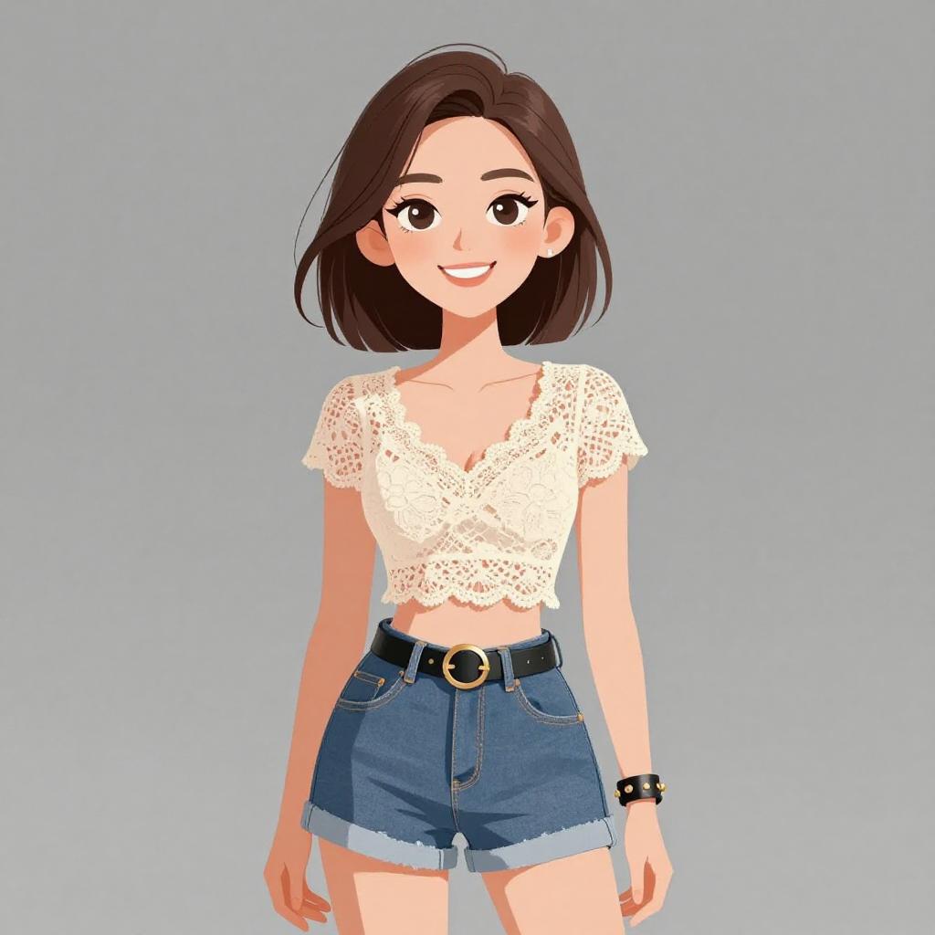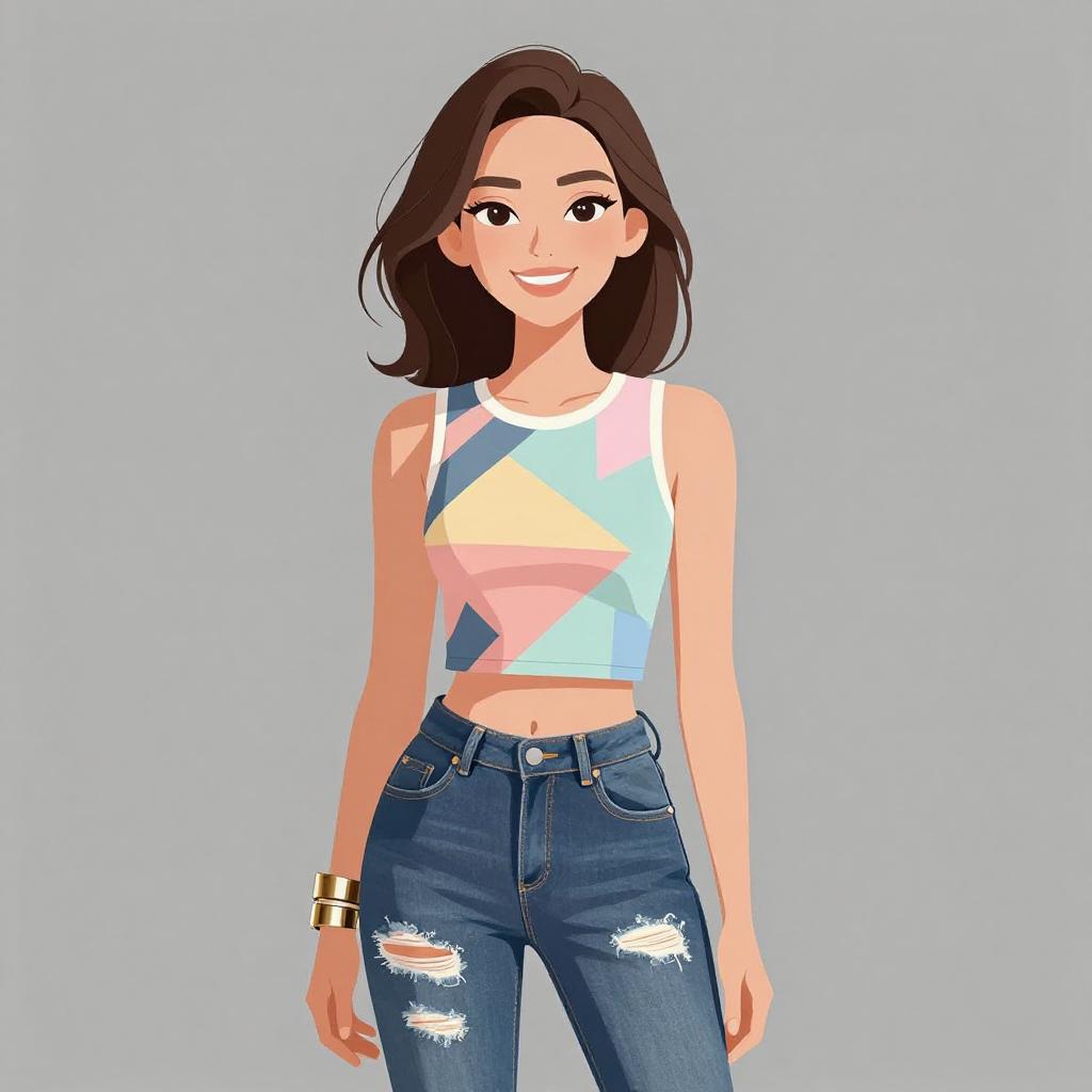 Woman with pretty face and pretty hair. smiling Woman, casual streetwear, tie-dye t-shirt in pastel pink, yellow and blue, relaxed fit, graphic print in the center, short rolled-up sleeves, light-wash distressed denim jeans with ripped knees, layered bracelets on one wrist, neutral background with gradient gray to white. --sref 1467