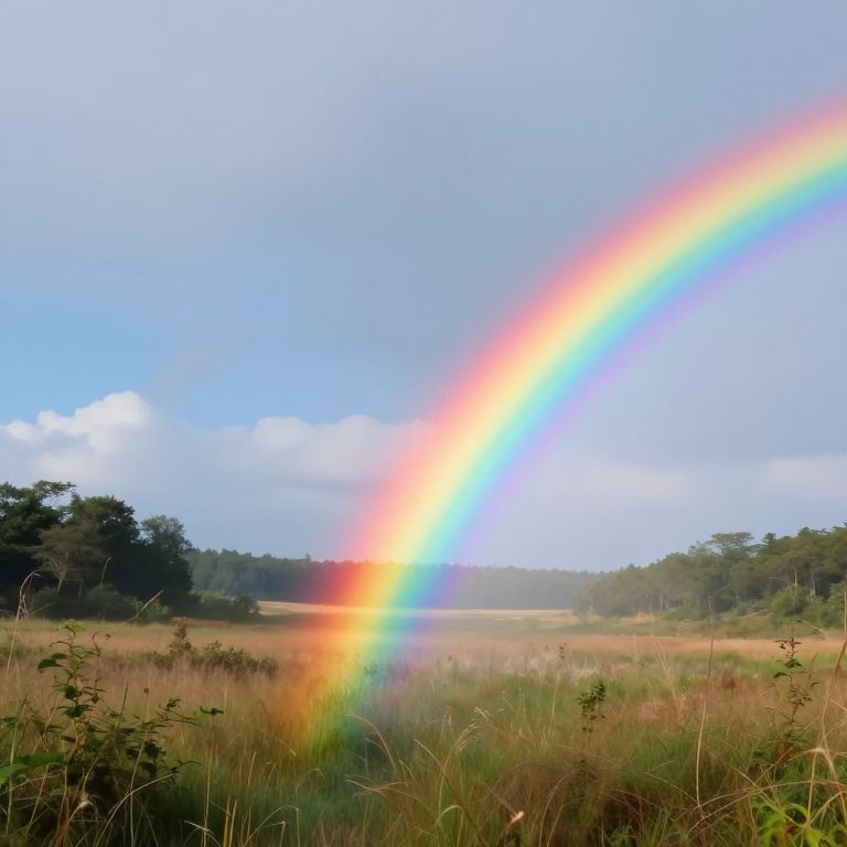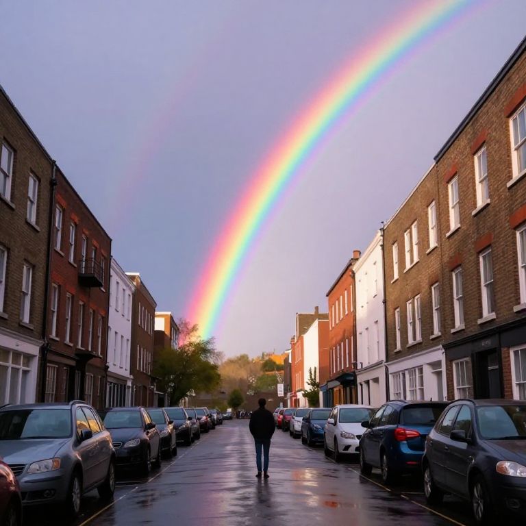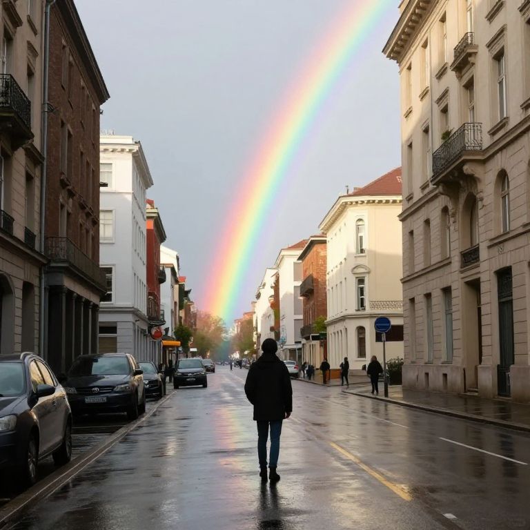 A solitary figure stands at the center of a wet urban street, bathed in the ethereal glow of a vibrant rainbow that defies gravity, arching majestically across the sky above a row of parked cars and brick buildings, creating a surreal bridge between reality and wonder.