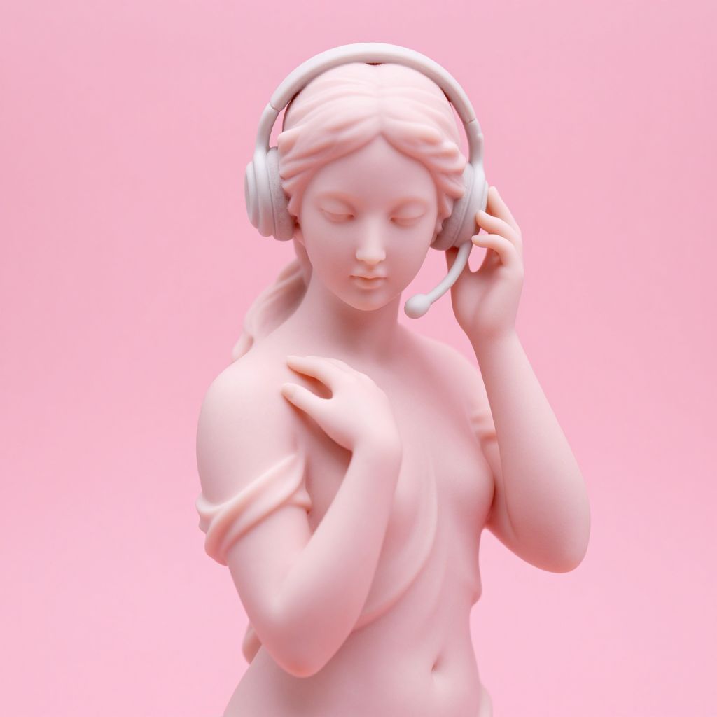 The image features a soft pink porcelain sculpture of a woman, reminiscent of classical art, with a modern twist. She is adorned with a headset, suggesting a blend of traditional and contemporary elements. The sculpture is positioned against a solid pink background, creating a harmonious color scheme that emphasizes the figure's delicate features and flowing hair. The woman's pose is graceful, with one hand gently resting on her shoulder and the other holding the headset, as if she is listening intently. The texture of the porcelain is smooth and refined, capturing the light softly and giving the sculpture a lifelike quality. The overall composition is balanced, with the sculpture centrally placed and the headset adding a dynamic element to the otherwise serene scene.