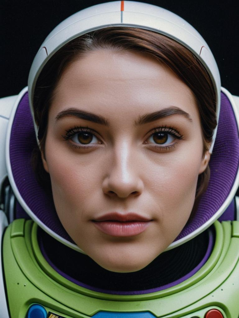 Woman in Buzz Lightyear Costume, close-up detailed headshot, photorealistic realism