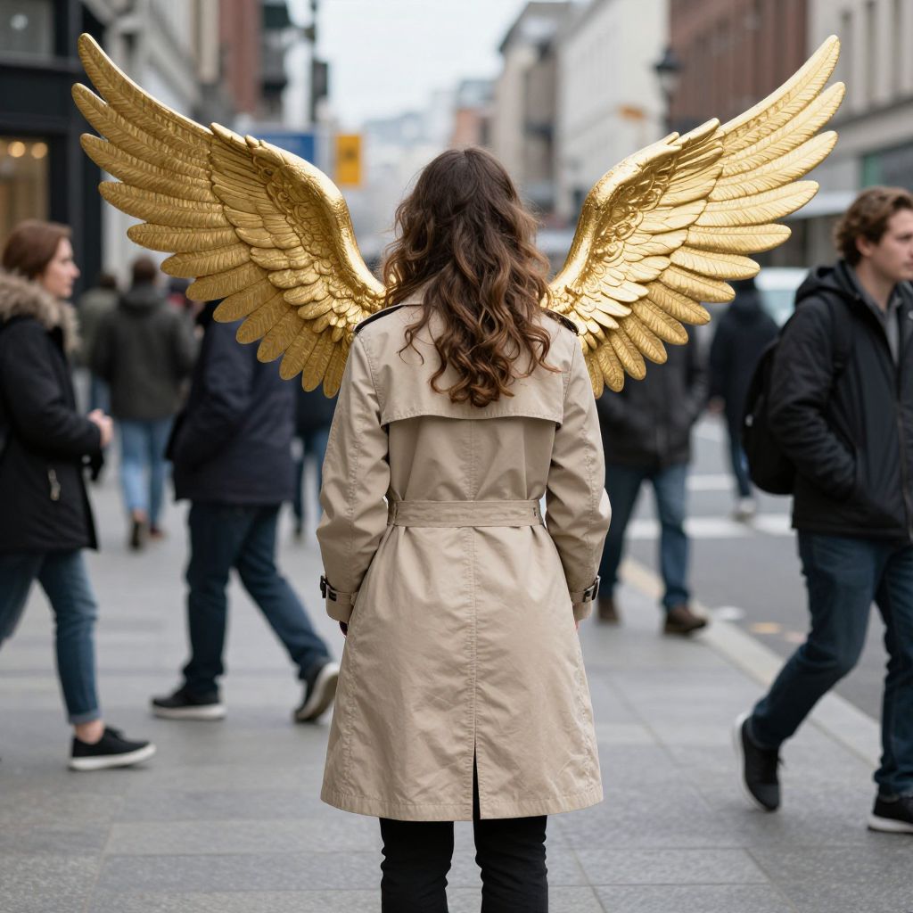 Urban streets buzz as a woman in a beige trench coat stands defiantly, her back adorned with large, golden wings that stretch symmetrically above her, drawing curious glances from pedestrians passing by.
