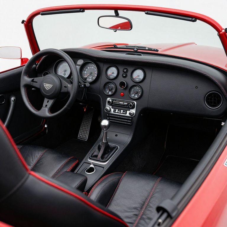 Photograph of a classic red convertible sports car's interior, viewed from the driver's seat. The dashboard features black gauges, a central gearshift with a metallic finish, and red accents on the seats and trim. The black leather seats have red stitching. The steering wheel, also black with red accents and a triangular logo, is positioned in the left foreground. The windshield is open, with a white, overcast sky visible through the frame. The overall design is sleek and retro, emphasizing a sporty, vintage aesthetic.
