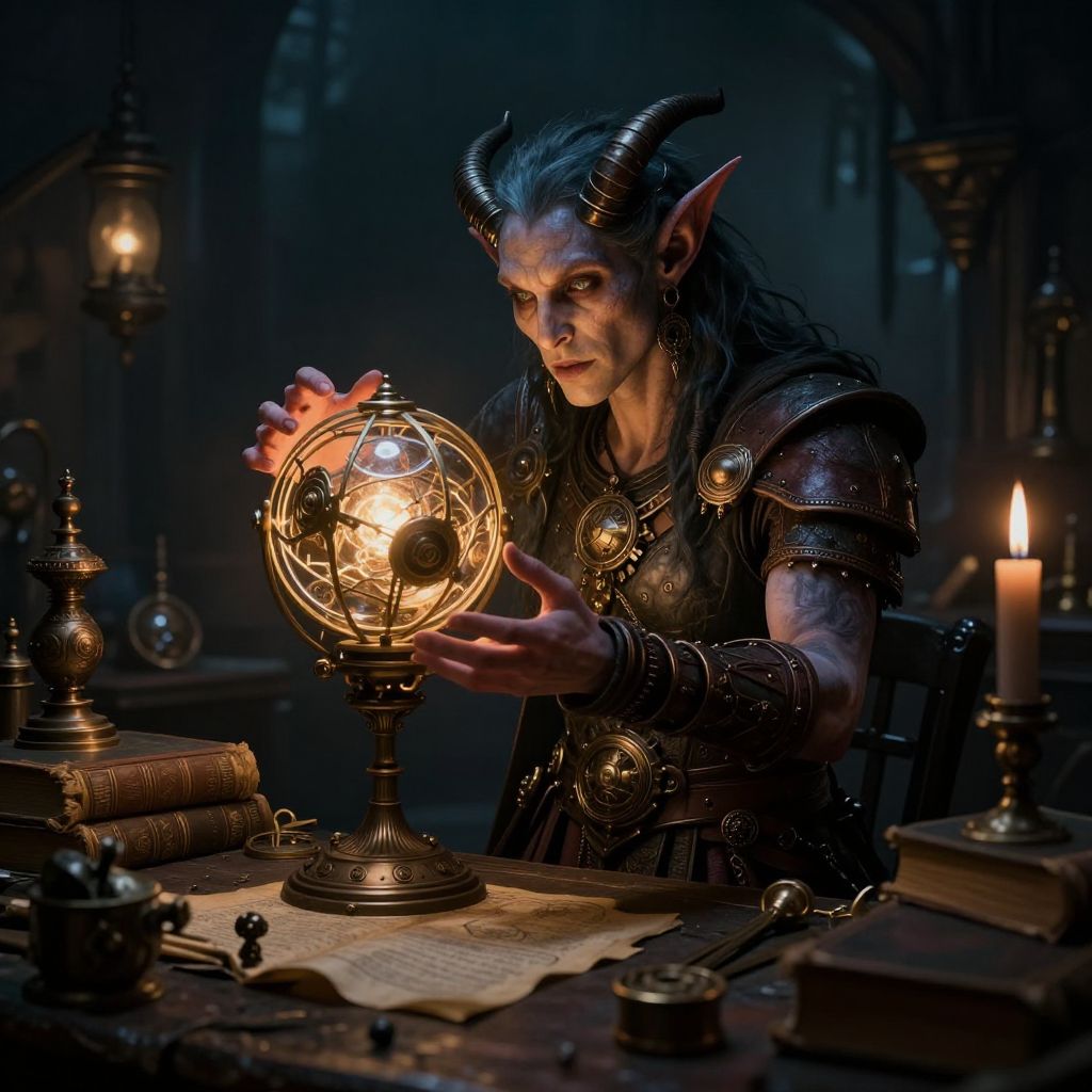 Tiefling artificer art portraying a clever half-demon inventor examining a glowing mechanical orb, in a workshop cluttered with ancient tomes, magical artifacts, and arcane tools, blending dark fantasy aesthetics with steampunk technology.