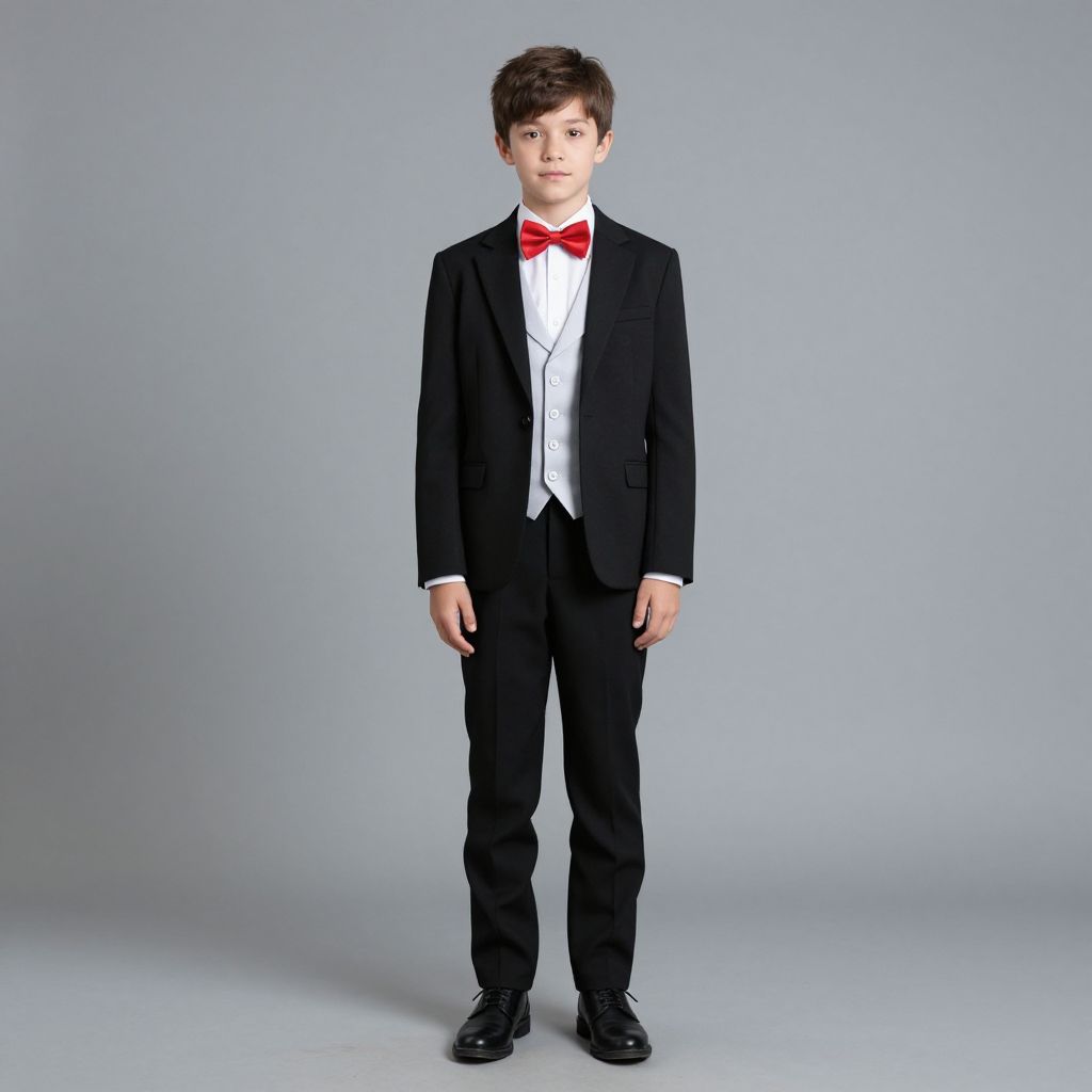Photograph of a young boy standing against a plain gray background. He has short, dark brown hair and a fair complexion. He is wearing a formal black tuxedo with a white dress shirt, a red bow tie, and black dress shoes. The tuxedo jacket is slightly oversized, and his hands rest loosely by his sides. The boy's expression is neutral, and he is centered in the image, facing the camera directly. The lighting is even, highlighting the textures of the fabric and the boy's smooth skin.