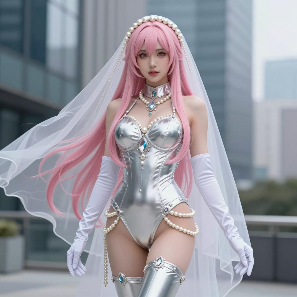 Pearl cosplay, digital art, anime-style, beautiful young woman, long pink hair, silver futuristic bodysuit, high-cut legs, pearl and crystal embellishments, long white gloves, white flowing veil, standing, confident expression, modern city background, soft light, realistic ures, detailed, high contrast, futuristic fantasy, detailed face, symmetrical features, slightly reflective fabric, highly polished look, elegant, sci-fi fashion, fantasy character, poised, sleek design, high detail, captivating atmosphere