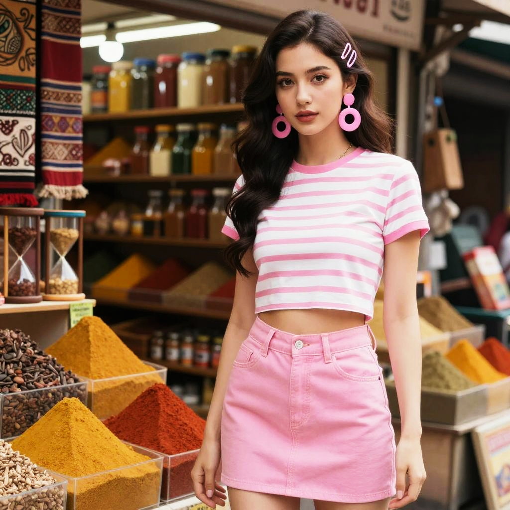 A hourglass woman in a retro pop style, wearing a striped pink and white cropped t-shirt and a high-waisted pink denim mini skirt, accessorized with statement round pink earrings and two hair clips. She stands in a vibrant street market spice shop, surrounded by colorful spices and textiles. Sexy. Pretty face and beutiful eyes