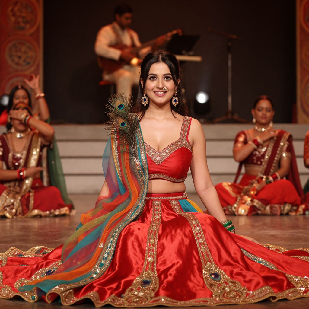 A bold and expressive woman in her late 20s with bright hazel eyes and a playful smirk wears a vibrant fancy satin lehenga costume with peacock feather accents and a bold red color. She is seated on a raised platform at a cultural performance, surrounded by dancers in traditional garments, the stage lit with warm stage lights and background music playing softly.. The woman has big tits and cute face