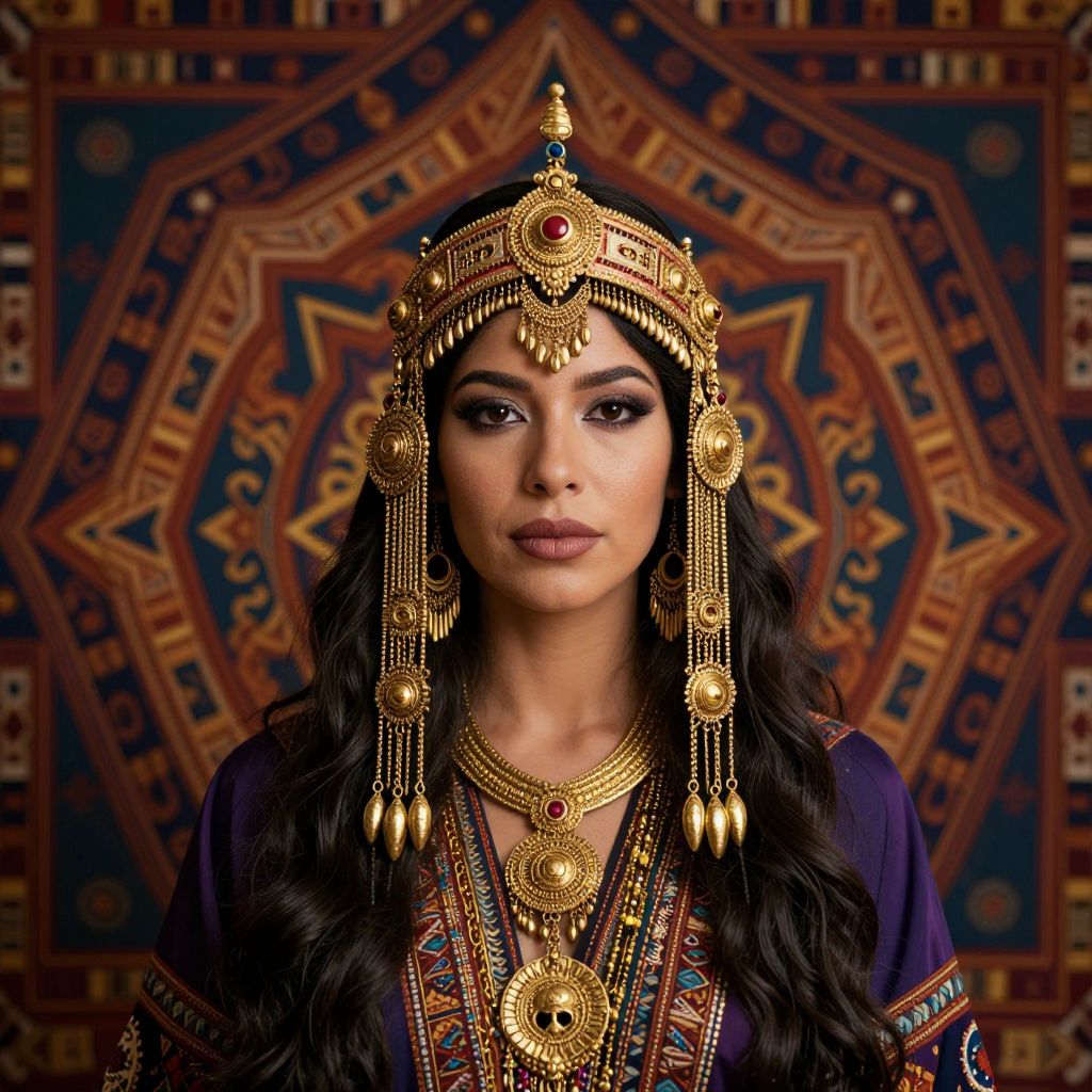 Photograph of a South Asian woman with long, wavy black hair, wearing an elaborate gold headpiece adorned with intricate jewelry and long, dangling earrings. She has dark, defined eyebrows, subtle makeup, and a neutral expression. She wears a richly patterned, dark blue traditional garment with gold and red embroidery. The background features a vibrant, geometric tapestry with red, blue, and gold patterns, enhancing the regal and cultural theme of the image. The woman's jewelry includes a large, central necklace with a detailed pendant. The overall style is traditional and elegant, highlighting cultural heritage.