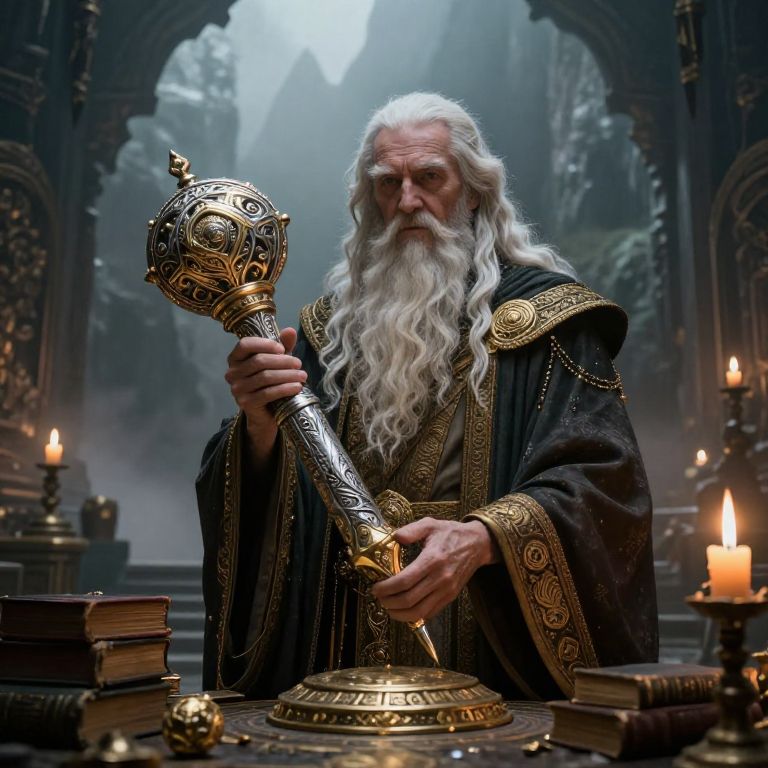 Mglw'nafh as a powerful artifact held by a wise elder in a foggy mountain temple, intricate gold and silver design, surrounded by arcane books and candles, cinematic lighting, fantasy realism