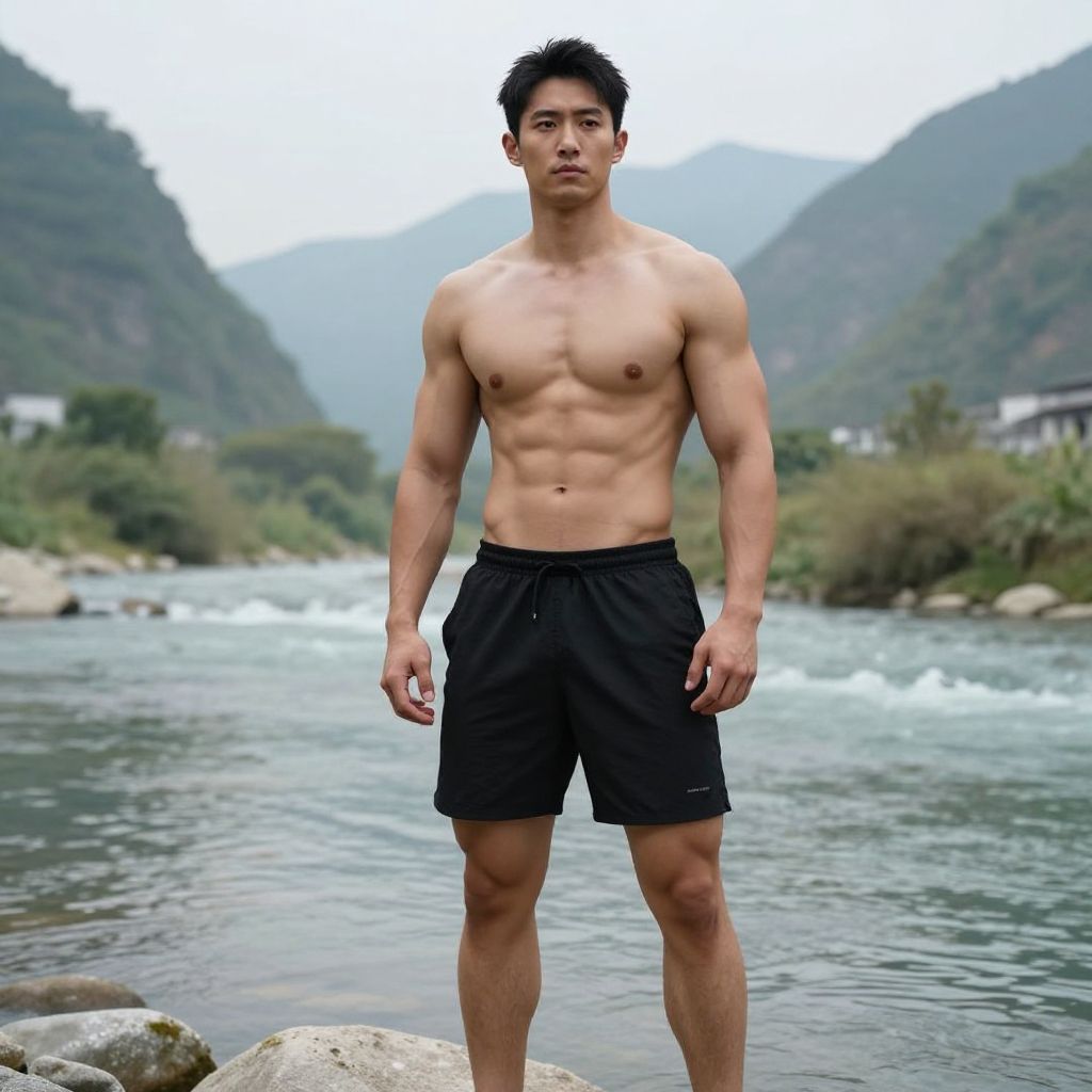Photograph of a muscular, shirtless Asian man standing in a river with a mountainous background. He has short, black hair and a serious expression. He is wearing black athletic shorts with a small white logo on the right side. His skin is light brown, and his well-defined abs and chest are visible. The river has clear, flowing water with rocks in the foreground. Green hills and misty mountains are in the background, with some trees and a distant white building. The sky is overcast, adding a cool tone to the image.