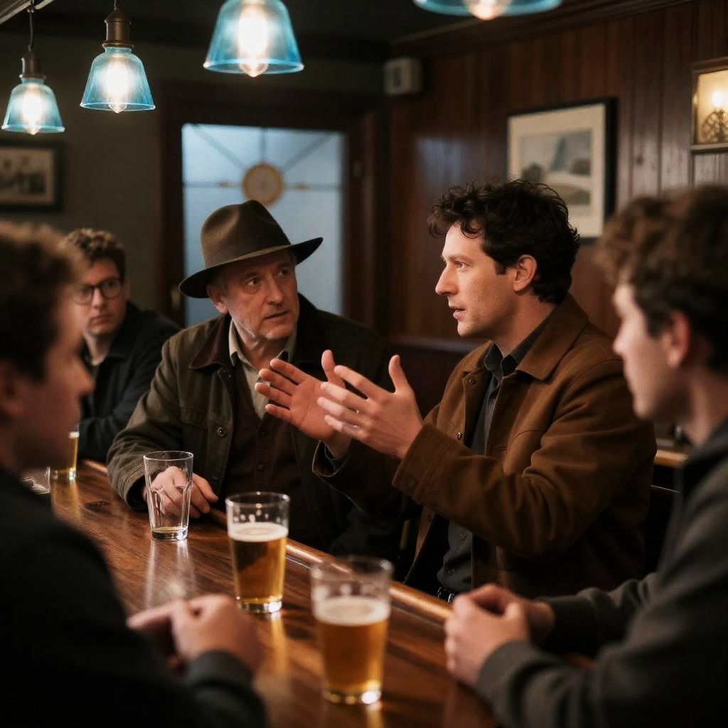 Photograph of a restaurant scene. Middle-aged woman with long brown hair, glasses, and brown coat stands smiling, holding a camera. Bald man in blue shirt and black jacket sits at table, facing her. Man with dark hair, brown jacket, and white shirt sits across from bald man. Two other men in white shirts and dark jackets stand in background. Blue and white tiled wall, hanging guitar, kitchen area in background.