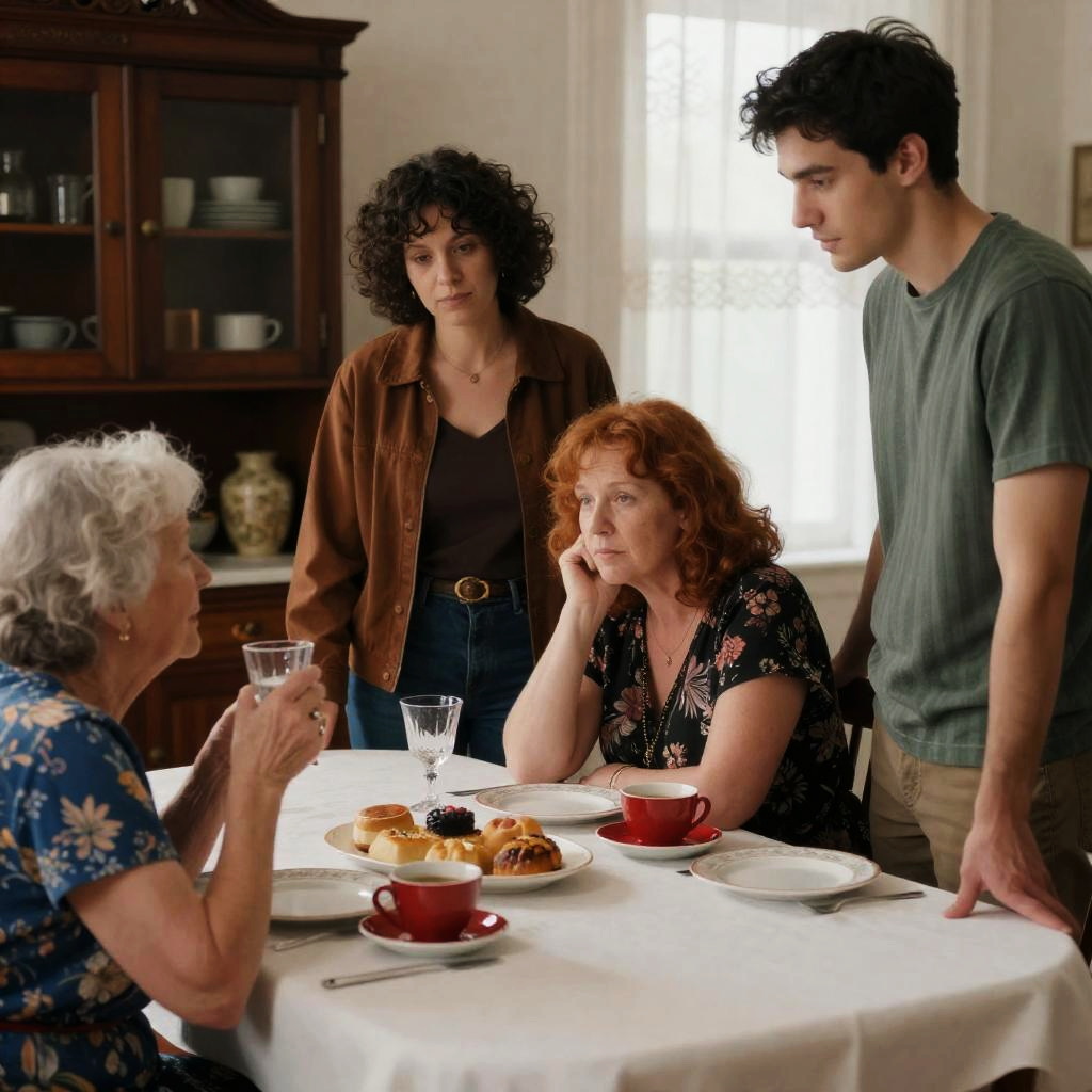 A middle-aged woman with long brown hair, glasses, and a brown coat stands smiling while holding a camera in a restaurant. Two men are seated at a table with plates of food, one bald man in a blue shirt and black jacket, and a dark-haired man wearing a brown jacket and white shirt. Two other men dressed in white shirts and dark jackets stand in the background near the kitchen area. The interior features blue and white tiled walls, a hanging guitar, and warm lighting.