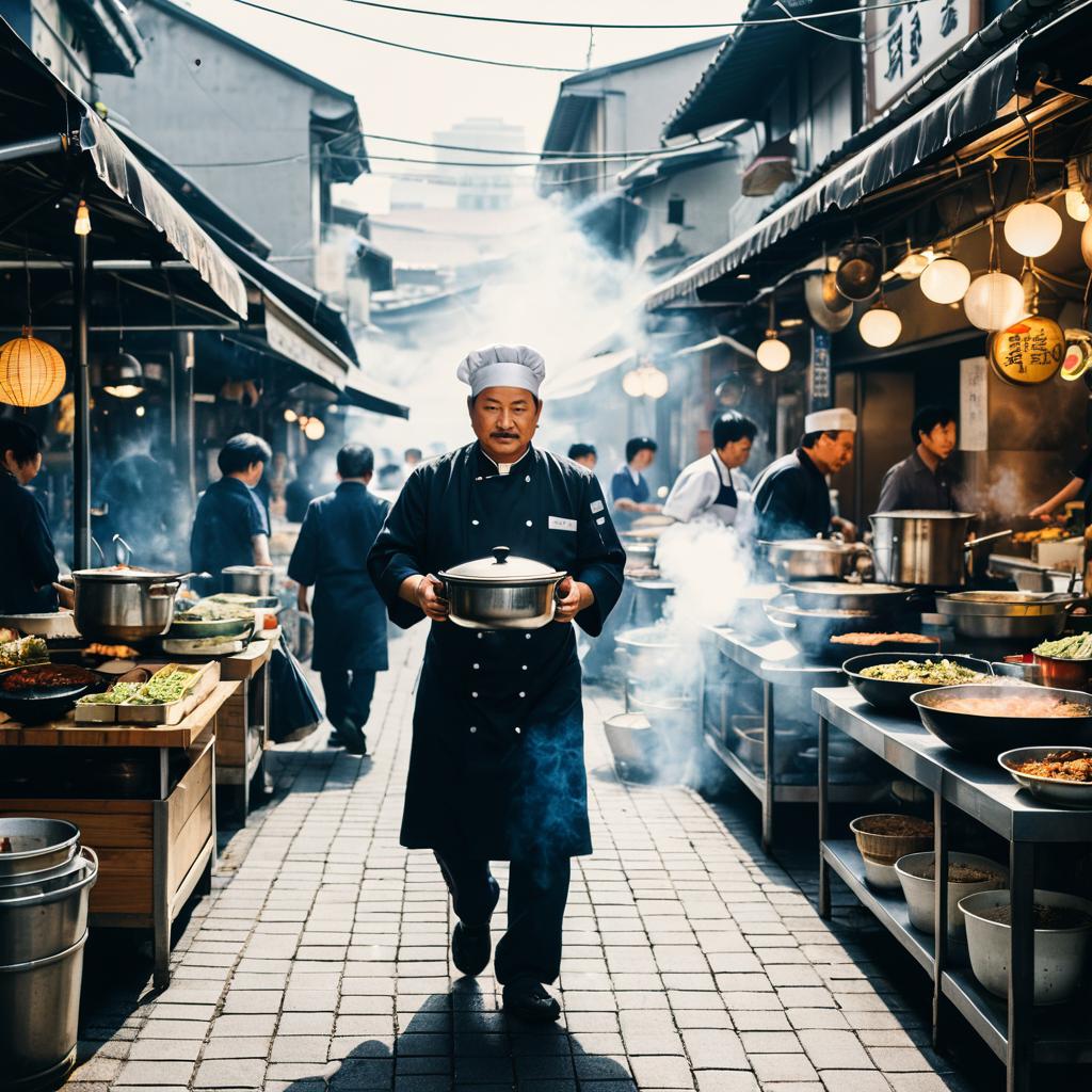 Middle-aged Asian male chef wearing a traditional black chef uniform and white chef hat walking through a busy open-air street food market. Surrounding him are food stalls filled with various dishes, steaming pots, and aromatic smoke coils hanging overhead. The scene is lively with multiple people in the background and illuminated paper lanterns adding to the atmosphere.
