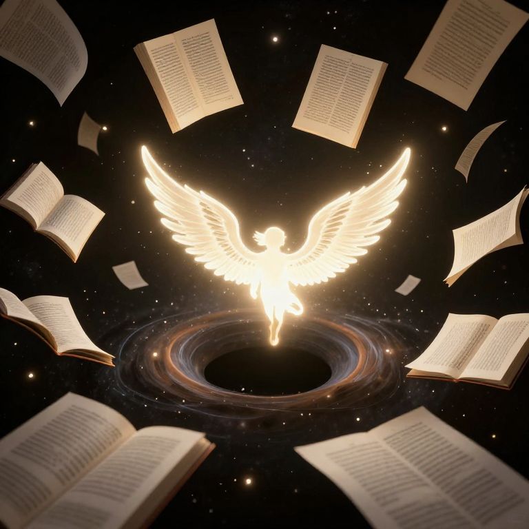 Digital artwork depicting a radiant, glowing white angel with outstretched wings hovering above a cosmic, swirling black hole. Surrounding the angel and black hole are numerous open books with yellowed pages, floating in space. The background is a deep black with small, twinkling stars. The angel's light contrasts sharply with the dark surroundings, creating a celestial and mystical atmosphere. The open books are positioned at various angles, enhancing the sense of depth and movement within the composition.