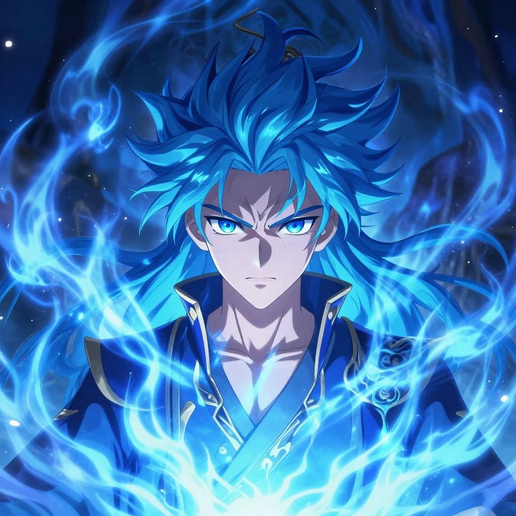 Blue hair anime characters boy surrounded by blue flames, mystical aura emanating from his body, powerful expression, intricate details in hair and eyes, epic fantasy anime composition