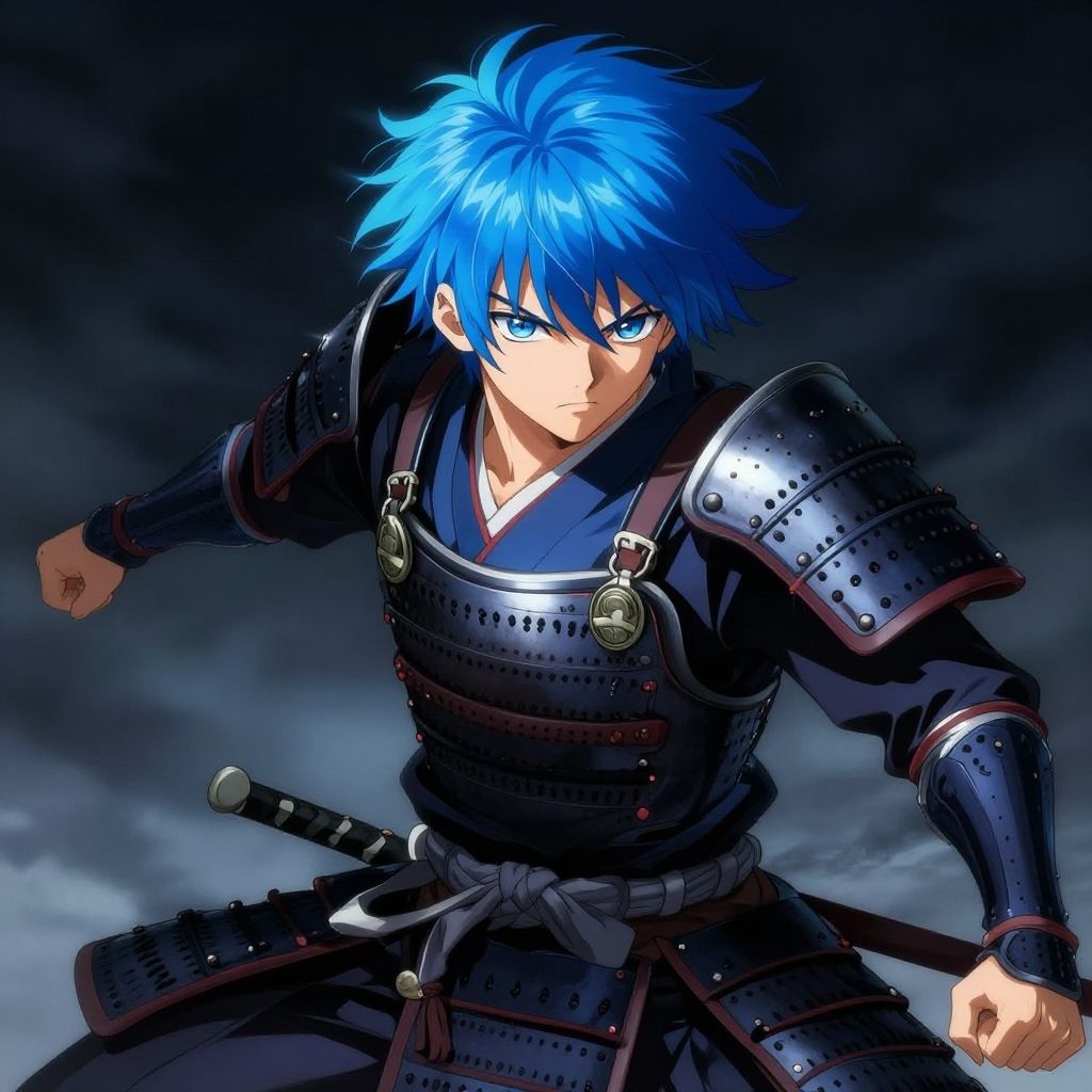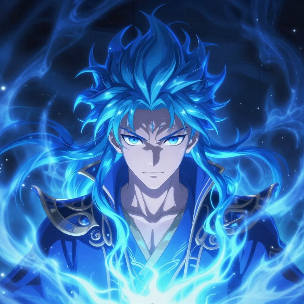 Digital anime-style illustration of a muscular, blue-haired male character with intense, glowing blue eyes. His hair is wild and spiky, with blue flames emanating from it. He wears a dark blue, ornate military-style jacket with metallic shoulder plates. The background is a deep, starry black, adding contrast to the bright blue flames that surround his head and shoulders. His expression is serious and focused, with a small, glowing blue mark on his forehead. The image is vibrant and dynamic, emphasizing the character's mystical and powerful aura.
