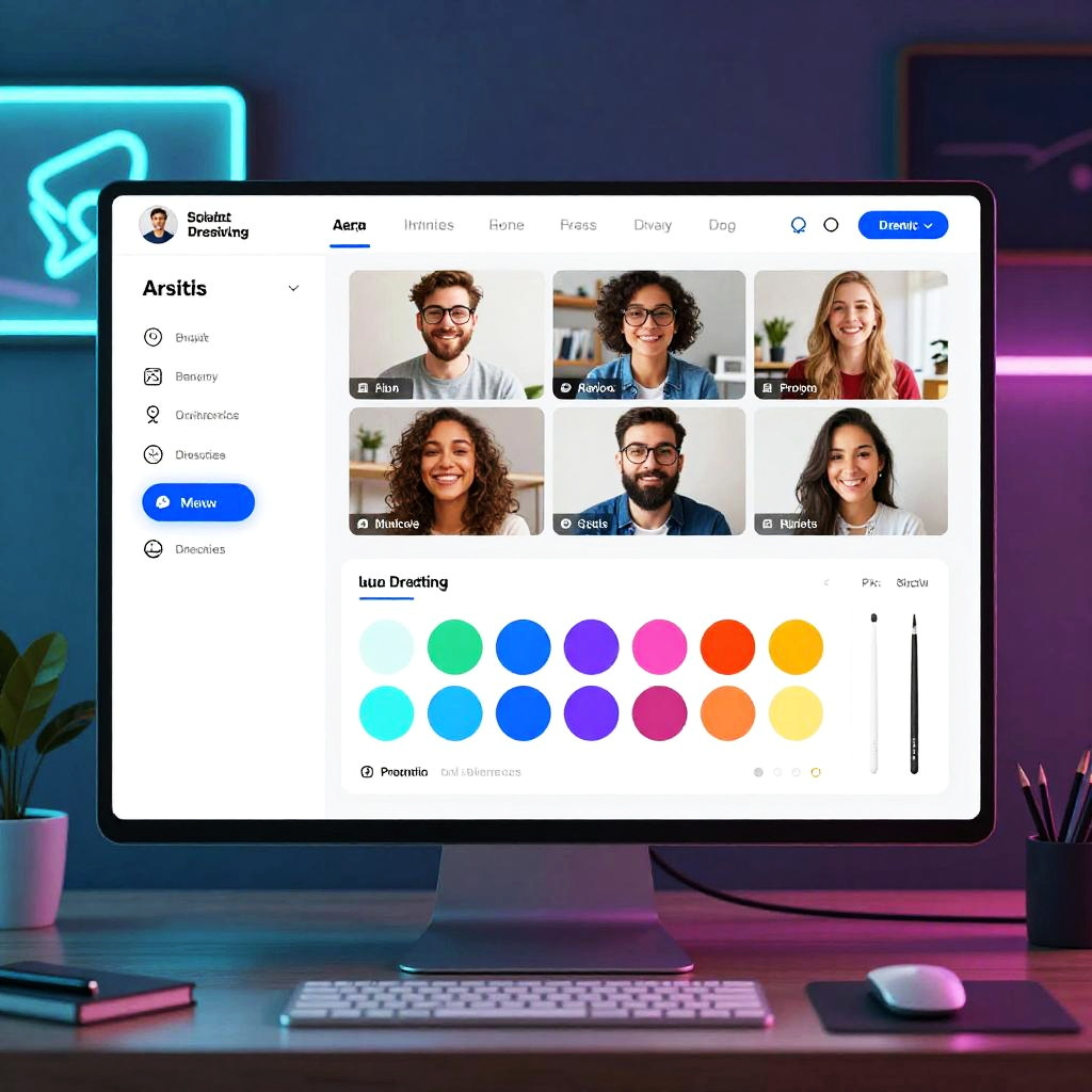 Ai drawing site interface showcasing intuitive digital brushes and tools, vibrant color palettes, artists collaborating online via video chat, futuristic desktop setup with multiple screens, clean user experience design, glowing UI elements, creative energy vibrant
