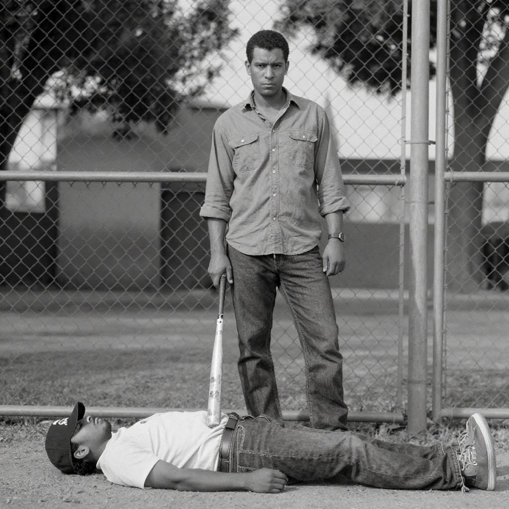 Black-and-white photograph of a man in a button-up shirt and jeans standing with a baseball bat in front of a chain-link fence. A person in a hat and shirt lies on the ground in the foreground. Trees and buildings are in the background. The man's expression is serious, and the scene has a gritty, urban feel.