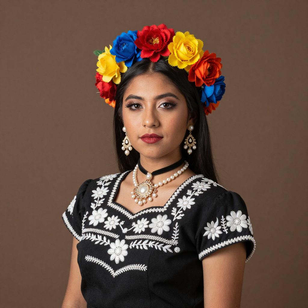 Portrait of a young woman wearing a traditional Mexican mariachi-style black dress adorned with white floral embroidery. She has long black hair decorated with a colorful flower crown featuring red, yellow, blue, and orange flowers. She accessorizes with pearl drop earrings, an ornate pearl necklace, and a black choker. The woman has brown eyes and is looking directly at the camera against a brown textured background.